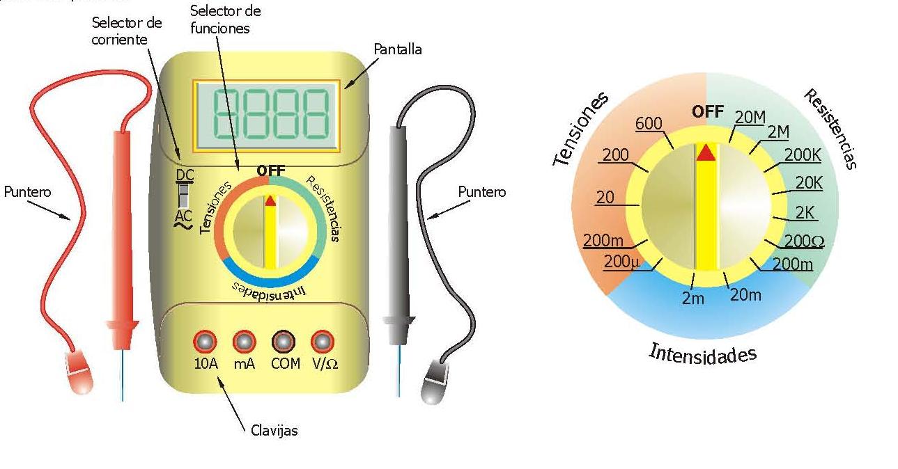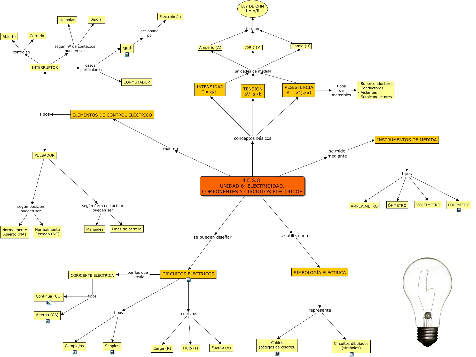 ΔV_a→b </mtext> </math> unidades de medida Ohmio (Ω), INSTRUMENTOS DE MEDIDA tipos VOLTÍMETRO, INTENSIDAD I = q/t unidades de medida Amperio (A), SIMBOLOGÍA ELÉCTRICA representa Cables (códigos de colores), SIMBOLOGÍA ELÉCTRICA representa Circuitos dibujados (símbolos), CIRCUITOS ELECTRICOS tipos Complejos, Ohmio (Ω) forman LEY DE OHM I = V/R, PULSADOR según forma de actuar pueden ser Manuales, RESISTENCIA R = ρ*(L/S) unidades de medida Amperio (A), CIRCUITOS ELECTRICOS requisitos Flujo (I), 4 E.S.O. UNIDAD 6: ELECTRICIDAD. COMPONENTES Y CIRCUITOS ELECTRICOS conceptos básicos INTENSIDAD I = q/t, 4 E.S.O. UNIDAD 6: ELECTRICIDAD. COMPONENTES Y CIRCUITOS ELECTRICOS conceptos básicos <math xmlns="http://www.w3.org/1998/Math/MathML"> <mtext> TENSIÓN