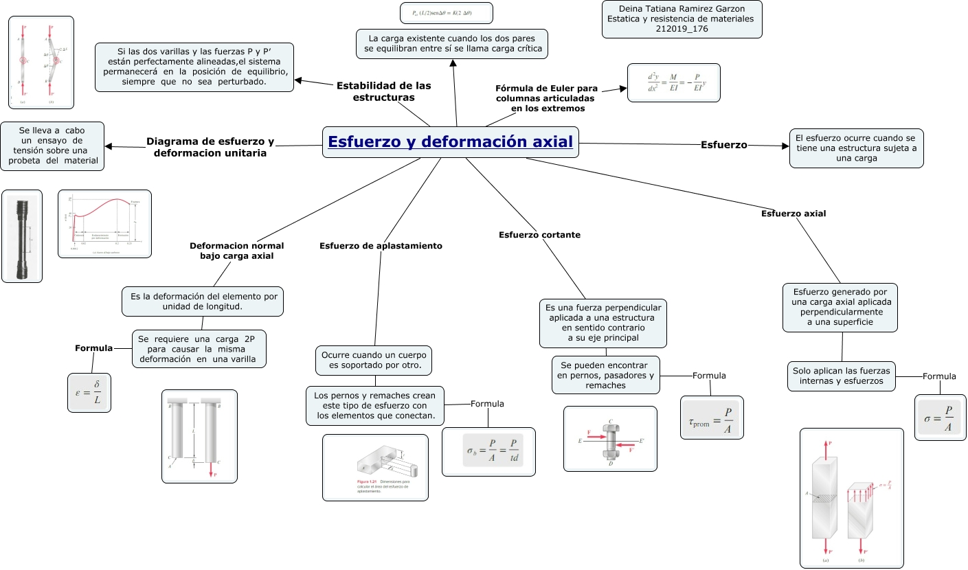 Este Cmap, tiene información relacionada con: Esfuerzo y Deformacion, Esfuerzo y deformación axial Esfuerzo axial Esfuerzo generado por una carga axial aplicada perpendicularmente a una superficie, Ocurre cuando un cuerpo es soportado por otro. ???? Los pernos y remaches crean este tipo de esfuerzo con los elementos que conectan., Esfuerzo y deformación axial Esfuerzo El esfuerzo ocurre cuando se tiene una estructura sujeta a una carga, Se requiere una carga 2P para causar la misma deformación en una varilla Formula, Esfuerzo y deformación axial Estabilidad de las estructuras Si las dos varillas y las fuerzas P y P′ están perfectamente alineadas,el sistema permanecerá en la posición de equilibrio, siempre que no sea perturbado., Esfuerzo y deformación axial Deformacion normal bajo carga axial Es la deformación del elemento por unidad de longitud., Esfuerzo y deformación axial Esfuerzo cortante Es una fuerza perpendicular aplicada a una estructura en sentido contrario a su eje principal, Esfuerzo y deformación axial ???? La carga existente cuando los dos pares se equilibran entre sí se llama carga crítica, Esfuerzo generado por una carga axial aplicada perpendicularmente a una superficie ???? Solo aplican las fuerzas internas y esfuerzos, Es una fuerza perpendicular aplicada a una estructura en sentido contrario a su eje principal ???? Se pueden encontrar en pernos, pasadores y remaches, Esfuerzo y deformación axial Fórmula de Euler para columnas articuladas en los extremos, Los pernos y remaches crean este tipo de esfuerzo con los elementos que conectan. Formula, Se pueden encontrar en pernos, pasadores y remaches Formula, Es la deformación del elemento por unidad de longitud. ???? Se requiere una carga 2P para causar la misma deformación en una varilla, Esfuerzo y deformación axial Esfuerzo de aplastamiento Ocurre cuando un cuerpo es soportado por otro., Solo aplican las fuerzas internas y esfuerzos Formula, Esfuerzo y deformación axial Diagrama de esfuerzo y deformacion unitaria Se lleva a cabo un ensayo de tensión sobre una probeta del material