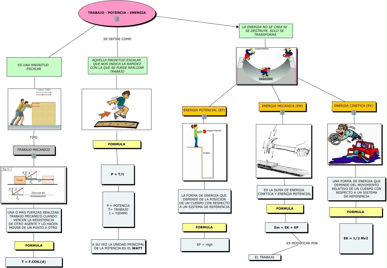 Este Cmap, tiene información relacionada con: Trabajo potencia y energia, ES LA SUMA DE ENERGIA CINETICA Y ENERGIA POTENCIAL ???? FORMULA, FORMULA ???? EP = mgh, TRABAJO - POTENCIA - ENERGIA SE DEFINE COMO AQUELLA MAGNITUD ESCALAR QUE NOS INDICA LA RAPIDEZ CON LA QUE SE PUEDE REALIZAR TRABAJO, ENERGIA MECANICA (EM) ????, LA FORMA DE ENERGIA QUE DEPENDE DE LA POSICION DE UN CUERPO CON RESPECTO A UN SISTEMA DE REFERENCIA ???? FORMULA, ???? ES LA SUMA DE ENERGIA CINETICA Y ENERGIA POTENCIAL, TRABAJO MECANICO ????, ???? UNA O MAS FUERZAS REALIZAN TRABAJO MECANICO CUANDO VENCEN LA RESISTENCIA DE OTRO AGENTE Y LO HACEN MOVER DE UN PUNTO A OTRO, TIPO TRABAJO MECANICO, P = T/t ???? P = POTENCIA T= TRABAJO t = TIEMPO, ???? LA FORMA DE ENERGIA QUE DEPENDE DE LA POSICION DE UN CUERPO CON RESPECTO A UN SISTEMA DE REFERENCIA, ???? ENERGIA CINETICA (EK), ES UNA MAGNITUD ESCALAR ????, ???? ENERGIA MECANICA (EM), ???? FORMULA, LA ENERGIA NO SE CREA NI SE DESTRUYE, SOLO SE TRANSFORMA ????, P = POTENCIA T= TRABAJO t = TIEMPO ???? A SU VEZ LA UNIDAD PRINCIPAL DE LA POTENCIA ES EL WATT, ???? ENERGIA POTENCIAL (EP), ENERGIA POTENCIAL (EP) ????, ENERGIA CINETICA (EK) ????