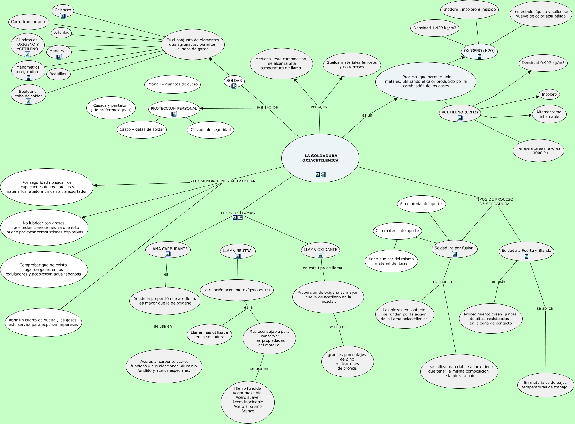Este Cmap, tiene información relacionada con: Soldadura Oxiacetilenica, PROTECCION PERSONAL ???? Calzado de seguridad, LA SOLDADURA OXIACETILENICA EQUIPO DE Es el conjunto de elementos que agrupados, permiten el paso de gases, LLAMA NEUTRA ???? La relación acetileno-oxígeno es 1:1, Es el conjunto de elementos que agrupados, permiten el paso de gases ???? Chispero, Proporción de oxigeno es mayor que la de acetileno en la mezcla . se usa en grandes porcentajes de Zinc y aleaciones de bronce., LA SOLDADURA OXIACETILENICA TIPOS DE LLAMAS LLAMA NEUTRA, OXIGENO (H2O) ???? Inodoro , incoloro e insipido, Proceso que permite unir metales, utilizando el calor producido por la combustión de los gases ???? OXIGENO (H2O), LLAMA CARBURANTE es Donde la proporción de acetileno, es mayor que la de oxigeno, LA SOLDADURA OXIACETILENICA RECOMENDACIONES AL TRABAJAR Comprobar que no exista fuga de gases en los reguladores y acoplescon agua jabonosa, Es el conjunto de elementos que agrupados, permiten el paso de gases ???? Cilindros de OXIGENO Y ACETILENO, LA SOLDADURA OXIACETILENICA es un Proceso que permite unir metales, utilizando el calor producido por la combustión de los gases, Es el conjunto de elementos que agrupados, permiten el paso de gases ???? Valvulas, Es el conjunto de elementos que agrupados, permiten el paso de gases ???? Manometros o reguladores, LA SOLDADURA OXIACETILENICA TIPOS DE LLAMAS LLAMA CARBURANTE, PROTECCION PERSONAL ???? Casco y gafas de soldar, ACETILENO (C2H2) Altamenteme inflamable, LA SOLDADURA OXIACETILENICA TIPOS DE LLAMAS LLAMA OXIDANTE, Es el conjunto de elementos que agrupados, permiten el paso de gases ???? Soplete o caña de soldar, PROTECCION PERSONAL ???? Calzado de seguridad
