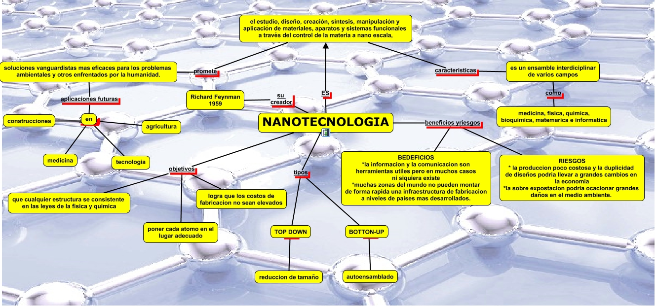Este Cmap, tiene información relacionada con: Nanotecnologia, medicina ???? en, NANOTECNOLOGIA objetivos poner cada atomo en el lugar adecuado, construcciones ???? en, NANOTECNOLOGIA beneficios yriesgos BEDEFICIOS *la informacion y la comunicacion son herramientas utiles pero en muchos casos ni siquiera existe *muchas zonas del mundo no pueden montar de forma rapida una infraestructura de fabricacion a niveles de paises mas desarrollados., NANOTECNOLOGIA tipos TOP DOWN, NANOTECNOLOGIA objetivos que cualquier estructura se consistente en las leyes de la fisica y quimica, el estudio, diseño, creación, síntesis, manipulación y aplicación de materiales, aparatos y sistemas funcionales a través del control de la materia a nano escala, promete soluciones vanguardistas mas eficaces para los problemas ambientales y otros enfrentados por la humanidad., soluciones vanguardistas mas eficaces para los problemas ambientales y otros enfrentados por la humanidad. aplicaciones futuras en, NANOTECNOLOGIA su creador Richard Feynman 1959, tecnologia ???? en, NANOTECNOLOGIA ES el estudio, diseño, creación, síntesis, manipulación y aplicación de materiales, aparatos y sistemas funcionales a través del control de la materia a nano escala,, NANOTECNOLOGIA tipos BOTTON-UP, autoensamblado ???? BOTTON-UP, es un ensamble interdiciplinar de varios campos como medicina, fisica, quimica, bioquimica, matemarica e informatica, agricultura ???? en, reduccion de tamaño ???? TOP DOWN, el estudio, diseño, creación, síntesis, manipulación y aplicación de materiales, aparatos y sistemas funcionales a través del control de la materia a nano escala, caracteristicas es un ensamble interdiciplinar de varios campos, NANOTECNOLOGIA beneficios yriesgos RIESGOS * la produccion poco costosa y la duplicidad de diseños podria llevar a grandes cambios en la economia *la sobre expostacion podria ocacionar grandes daños en el medio ambiente., NANOTECNOLOGIA objetivos logra que los costos de fabricacion no sean elevados