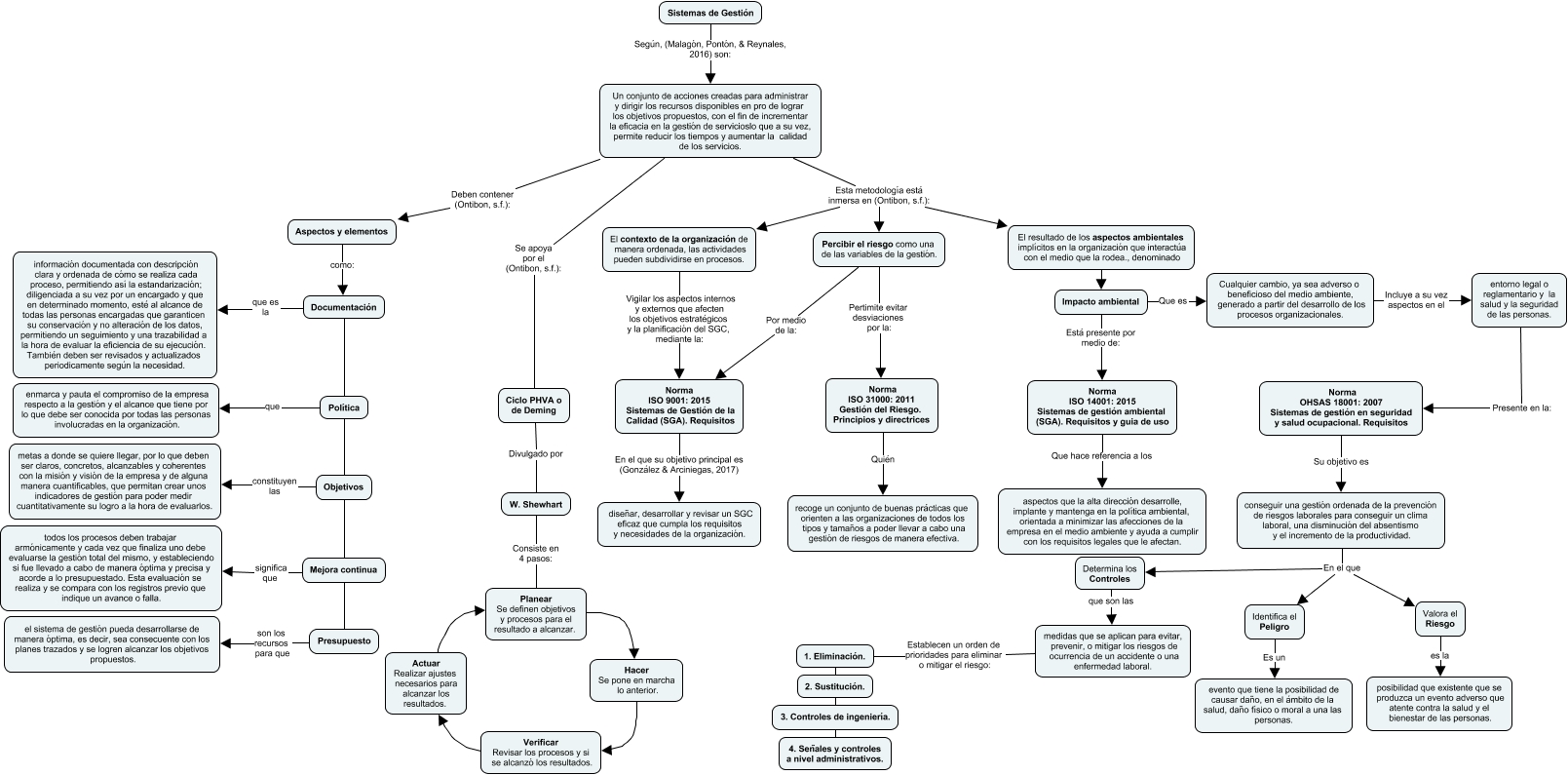 Este Cmap, tiene información relacionada con: Sistemas de gestion NORMA ISO Y OHSAS, Norma ISO 31000: 2011 Gestión del Riesgo. Principios y directrices Quién recoge un conjunto de buenas prácticas que orienten a las organizaciones de todos los tipos y tamaños a poder llevar a cabo una gestión de riesgos de manera efectiva., Presupuesto son los recursos para que el sistema de gestión pueda desarrollarse de manera óptima, es decir, sea consecuente con los planes trazados y se logren alcanzar los objetivos propuestos., Ciclo PHVA o de Deming Divulgado por W. Shewhart, Percibir el riesgo como una de las variables de la gestión. Por medio de la: Norma ISO 9001: 2015 Sistemas de Gestión de la Calidad (SGA). Requisitos, Documentación que es la información documentada con descripción clara y ordenada de cómo se realiza cada proceso, permitiendo así la estandarización; diligenciada a su vez por un encargado y que en determinado momento, esté al alcance de todas las personas encargadas que garanticen su conservación y no alteración de los datos, permitiendo un seguimiento y una trazabilidad a la hora de evaluar la eficiencia de su ejecución. También deben ser revisados y actualizados periodicamente según la necesidad., Objetivos constituyen las metas a donde se quiere llegar, por lo que deben ser claros, concretos, alcanzables y coherentes con la misión y visión de la empresa y de alguna manera cuantificables, que permitan crear unos indicadores de gestión para poder medir cuantitativamente su logro a la hora de evaluarlos., Documentación Política, Política Objetivos, medidas que se aplican para evitar, prevenir, o mitigar los riesgos de ocurrencia de un accidente o una enfermedad laboral. Establecen un orden de prioridades para eliminar o mitigar el riesgo: 1. Eliminación., 2. Sustitución. 3. Controles de ingeniería., Percibir el riesgo como una de las variables de la gestión. Pertimite evitar desviaciones por la: Norma ISO 31000: 2011 Gestión del Riesgo. Principios y directrices, Aspectos y elementos como: Documentación, Impacto ambiental Que es Cualquier cambio, ya sea adverso o beneficioso del medio ambiente, generado a partir del desarrollo de los procesos organizacionales., El resultado de los aspectos ambientales implícitos en la organización que interactúa con el medio que la rodea., denominado Impacto ambiental, conseguir una gestión ordenada de la prevención de riesgos laborales para conseguir un clima laboral, una disminución del absentismo y el incremento de la productividad. En el que Valora el Riesgo, Sistemas de Gestión Según, (Malagón, Pontón, & Reynales, 2016) son: Un conjunto de acciones creadas para administrar y dirigir los recursos disponibles en pro de lograr los objetivos propuestos, con el fin de incrementar la eficacia en la gestión de servicioslo que a su vez, permite reducir los tiempos y aumentar la calidad de los servicios., Un conjunto de acciones creadas para administrar y dirigir los recursos disponibles en pro de lograr los objetivos propuestos, con el fin de incrementar la eficacia en la gestión de servicioslo que a su vez, permite reducir los tiempos y aumentar la calidad de los servicios. Se apoya por el (Ontibon, s.f.): Ciclo PHVA o de Deming, Objetivos Mejora continua, Hacer Se pone en marcha lo anterior. Verificar Revisar los procesos y si se alcanzó los resultados., Actuar Realizar ajustes necesarios para alcanzar los resultados. Planear Se definen objetivos y procesos para el resultado a alcanzar.