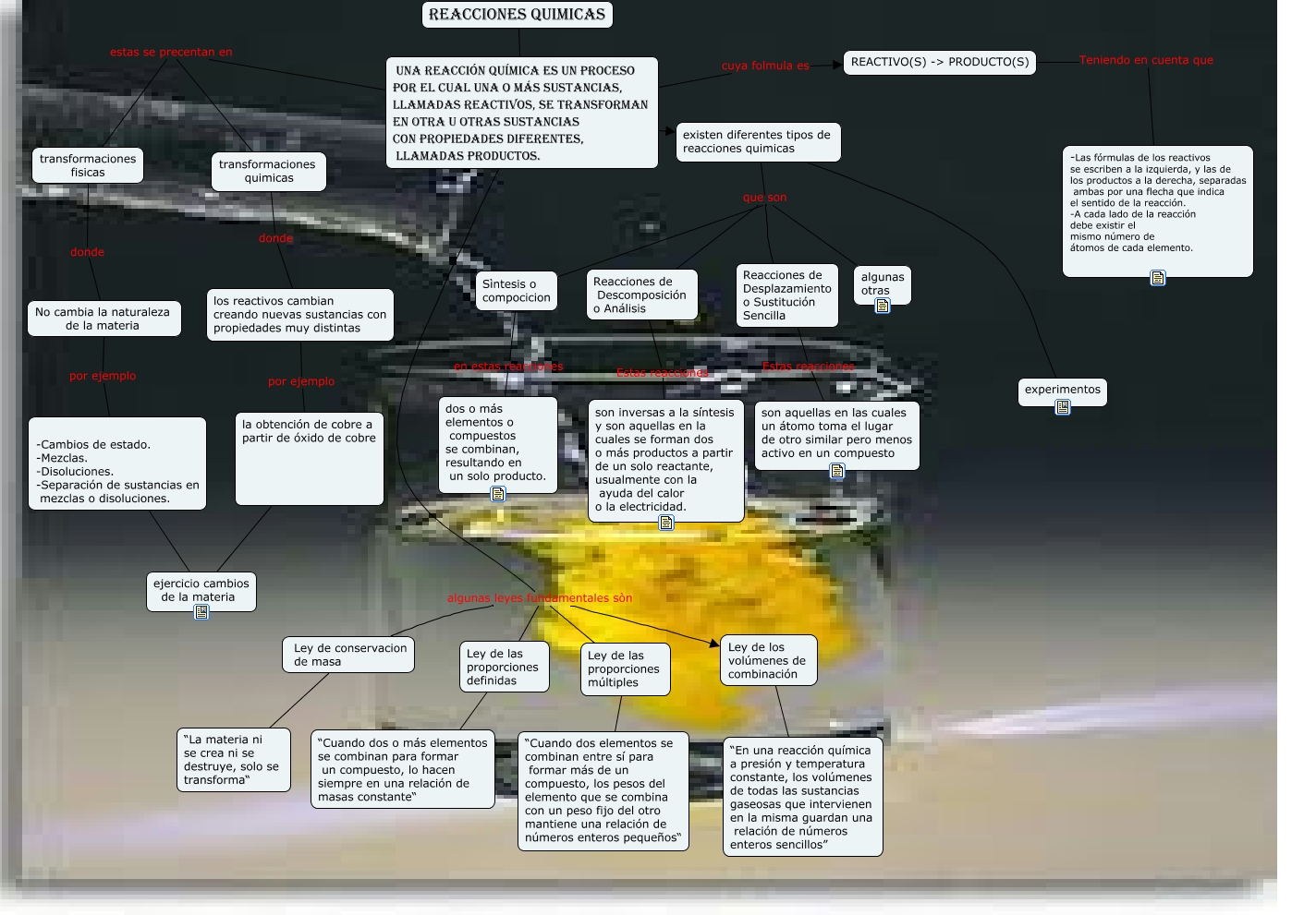 Este Cmap, tiene información relacionada con: Reacciones quimicas, Sìntesis o compocicion que son Reacciones de Desplazamiento o Sustitución Sencilla, Una reacción química es un proceso por el cual una o más sustancias, llamadas reactivos, se transforman en otra u otras sustancias con propiedades diferentes, llamadas productos. estas se precentan en transformaciones quimicas, Sìntesis o compocicion en estas reacciones dos o más elementos o compuestos se combinan, resultando en un solo producto., la obtención de cobre a partir de óxido de cobre ejercicio cambios de la materia, Ley de los volúmenes de combinación “En una reacción química a presión y temperatura constante, los volúmenes de todas las sustancias gaseosas que intervienen en la misma guardan una relación de números enteros sencillos”, Sìntesis o compocicion que son Reacciones de Descomposición o Análisis, Sìntesis o compocicion que son algunas otras, Reacciones de Desplazamiento o Sustitución Sencilla Estas reacciones son aquellas en las cuales un átomo toma el lugar de otro similar pero menos activo en un compuesto, No cambia la naturaleza de la materia por ejemplo -Cambios de estado. -Mezclas. -Disoluciones. -Separación de sustancias en mezclas o disoluciones., los reactivos cambian creando nuevas sustancias con propiedades muy distintas por ejemplo la obtención de cobre a partir de óxido de cobre, Una reacción química es un proceso por el cual una o más sustancias, llamadas reactivos, se transforman en otra u otras sustancias con propiedades diferentes, llamadas productos. algunas leyes fundamentales sòn Ley de los volúmenes de combinación, Reacciones de Descomposición o Análisis Estas reacciones son inversas a la síntesis y son aquellas en la cuales se forman dos o más productos a partir de un solo reactante, usualmente con la ayuda del calor o la electricidad., Ley de conservacion de masa “La materia ni se crea ni se destruye, solo se transforma“, Una reacción química es un proceso por el cual una o más sustancias, llamadas reactivos, se transforman en otra u otras sustancias con propiedades diferentes, llamadas productos. estas se precentan en transformaciones fisicas, Ley de las proporciones múltiples “Cuando dos elementos se combinan entre sí para formar más de un compuesto, los pesos del elemento que se combina con un peso fijo del otro mantiene una relación de números enteros pequeños“, REACCIONES QUIMICAS Una reacción química es un proceso por el cual una o más sustancias, llamadas reactivos, se transforman en otra u otras sustancias con propiedades diferentes, llamadas productos., transformaciones fisicas donde No cambia la naturaleza de la materia, -Cambios de estado. -Mezclas. -Disoluciones. -Separación de sustancias en mezclas o disoluciones. ejercicio cambios de la materia, transformaciones quimicas donde los reactivos cambian creando nuevas sustancias con propiedades muy distintas, Una reacción química es un proceso por el cual una o más sustancias, llamadas reactivos, se transforman en otra u otras sustancias con propiedades diferentes, llamadas productos. cuya folmula es REACTIVO(S) -> PRODUCTO(S)