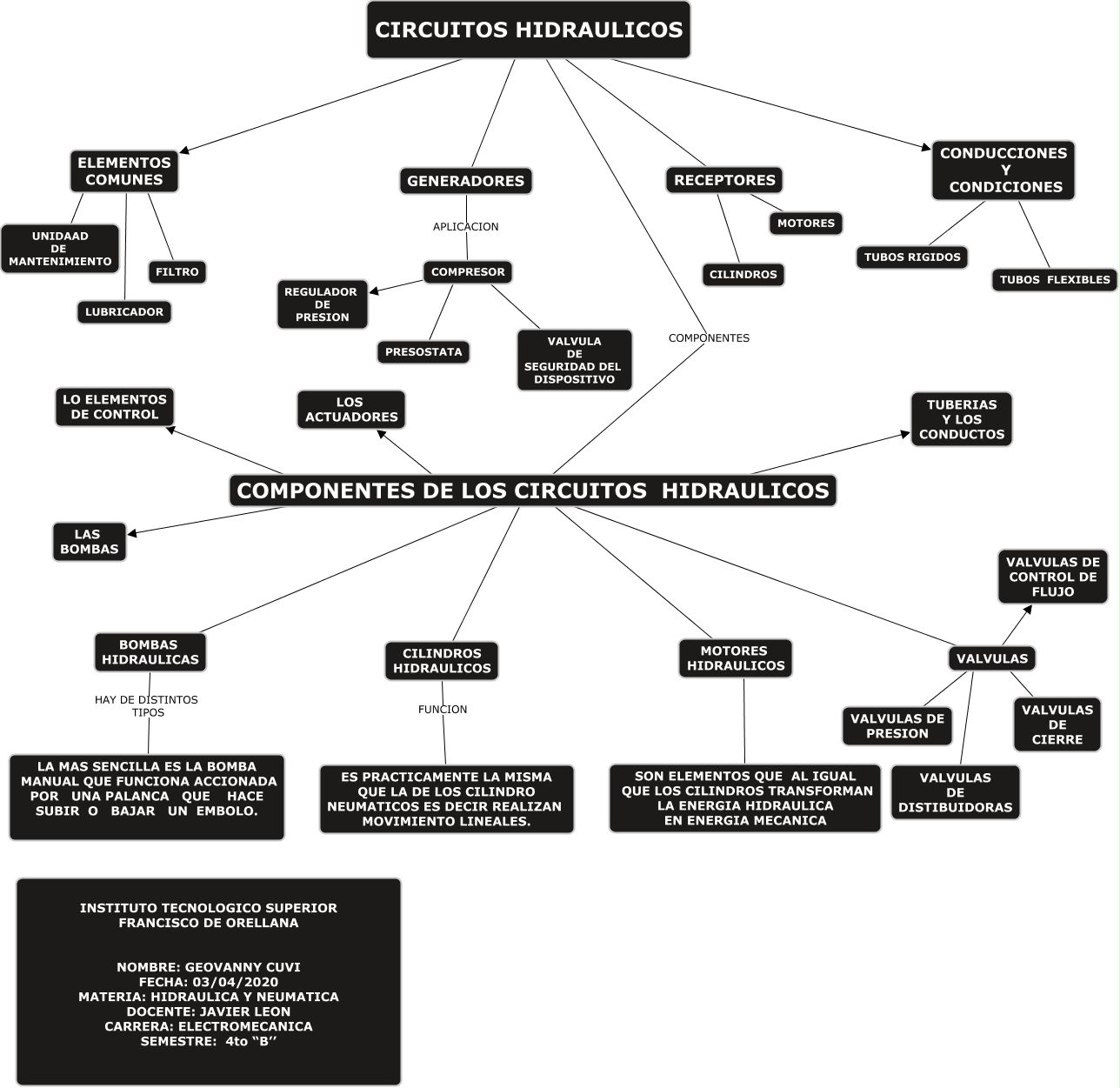 Este Cmap, tiene información relacionada con: Circuitos Hidraulicos, COMPONENTES DE LOS CIRCUITOS HIDRAULICOS ???? CILINDROS HIDRAULICOS, BOMBAS HIDRAULICAS HAY DE DISTINTOS TIPOS LA MAS SENCILLA ES LA BOMBA MANUAL QUE FUNCIONA ACCIONADA POR UNA PALANCA QUE HACE SUBIR O BAJAR UN EMBOLO., COMPONENTES DE LOS CIRCUITOS HIDRAULICOS ???? MOTORES HIDRAULICOS, ELEMENTOS COMUNES ???? FILTRO, COMPONENTES DE LOS CIRCUITOS HIDRAULICOS ???? TUBERIAS Y LOS CONDUCTOS, GENERADORES APLICACION COMPRESOR, ELEMENTOS COMUNES ???? UNIDAAD DE MANTENIMIENTO, RECEPTORES ???? MOTORES, RECEPTORES ???? CILINDROS, VALVULAS ???? VALVULAS DE CIERRE, COMPONENTES DE LOS CIRCUITOS HIDRAULICOS ???? LAS BOMBAS, COMPRESOR ???? PRESOSTATA, CONDUCCIONES Y CONDICIONES ???? TUBOS RIGIDOS, CILINDROS HIDRAULICOS FUNCION ES PRACTICAMENTE LA MISMA QUE LA DE LOS CILINDRO NEUMATICOS ES DECIR REALIZAN MOVIMIENTO LINEALES., VALVULAS ???? VALVULAS DE CONTROL DE FLUJO, COMPRESOR ???? VALVULA DE SEGURIDAD DEL DISPOSITIVO, MOTORES HIDRAULICOS ???? SON ELEMENTOS QUE AL IGUAL QUE LOS CILINDROS TRANSFORMAN LA ENERGIA HIDRAULICA EN ENERGIA MECANICA, VALVULAS ???? VALVULAS DE PRESION, COMPRESOR ???? REGULADOR DE PRESION, CIRCUITOS HIDRAULICOS ???? GENERADORES
