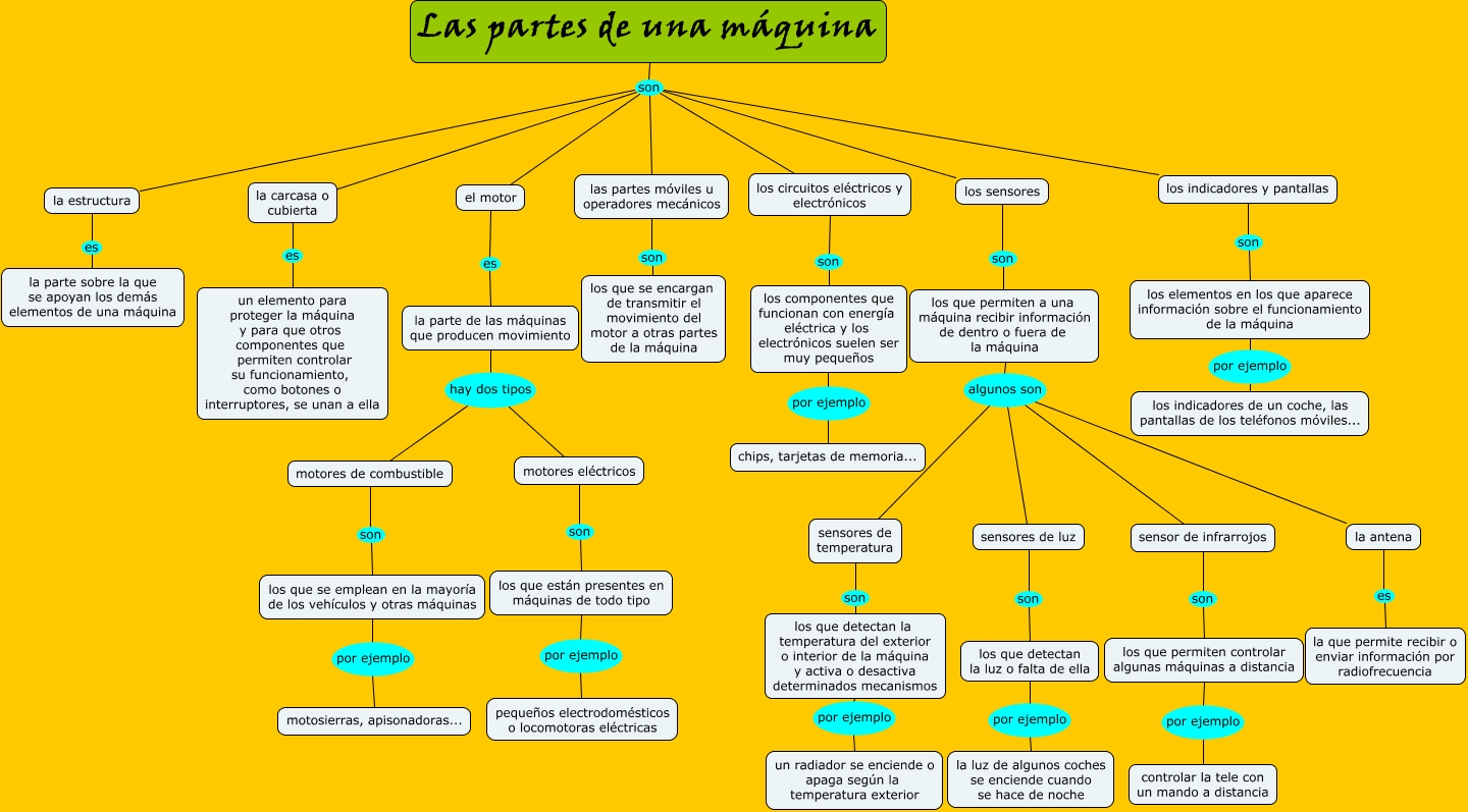 Este Cmap, tiene información relacionada con: Las partes de una máquina, los elementos en los que aparece información sobre el funcionamiento de la máquina por ejemplo los indicadores de un coche, las pantallas de los teléfonos móviles..., la carcasa o cubierta es un elemento para proteger la máquina y para que otros componentes que permiten controlar su funcionamiento, como botones o interruptores, se unan a ella, sensores de luz son los que detectan la luz o falta de ella, la parte de las máquinas que producen movimiento hay dos tipos motores eléctricos, el motor es la parte de las máquinas que producen movimiento, la estructura es la parte sobre la que se apoyan los demás elementos de una máquina, la parte de las máquinas que producen movimiento hay dos tipos motores de combustible, Las partes de una máquina son la carcasa o cubierta, los que están presentes en máquinas de todo tipo por ejemplo pequeños electrodomésticos o locomotoras eléctricas, los indicadores y pantallas son los elementos en los que aparece información sobre el funcionamiento de la máquina, Las partes de una máquina son los sensores, los que permiten a una máquina recibir información de dentro o fuera de la máquina algunos son la antena, Las partes de una máquina son los indicadores y pantallas, Las partes de una máquina son el motor, los sensores son los que permiten a una máquina recibir información de dentro o fuera de la máquina, las partes móviles u operadores mecánicos son los que se encargan de transmitir el movimiento del motor a otras partes de la máquina, Las partes de una máquina son los circuitos eléctricos y electrónicos, los que permiten controlar algunas máquinas a distancia por ejemplo controlar la tele con un mando a distancia, la antena es la que permite recibir o enviar información por radiofrecuencia, los que se emplean en la mayoría de los vehículos y otras máquinas por ejemplo motosierras, apisonadoras...