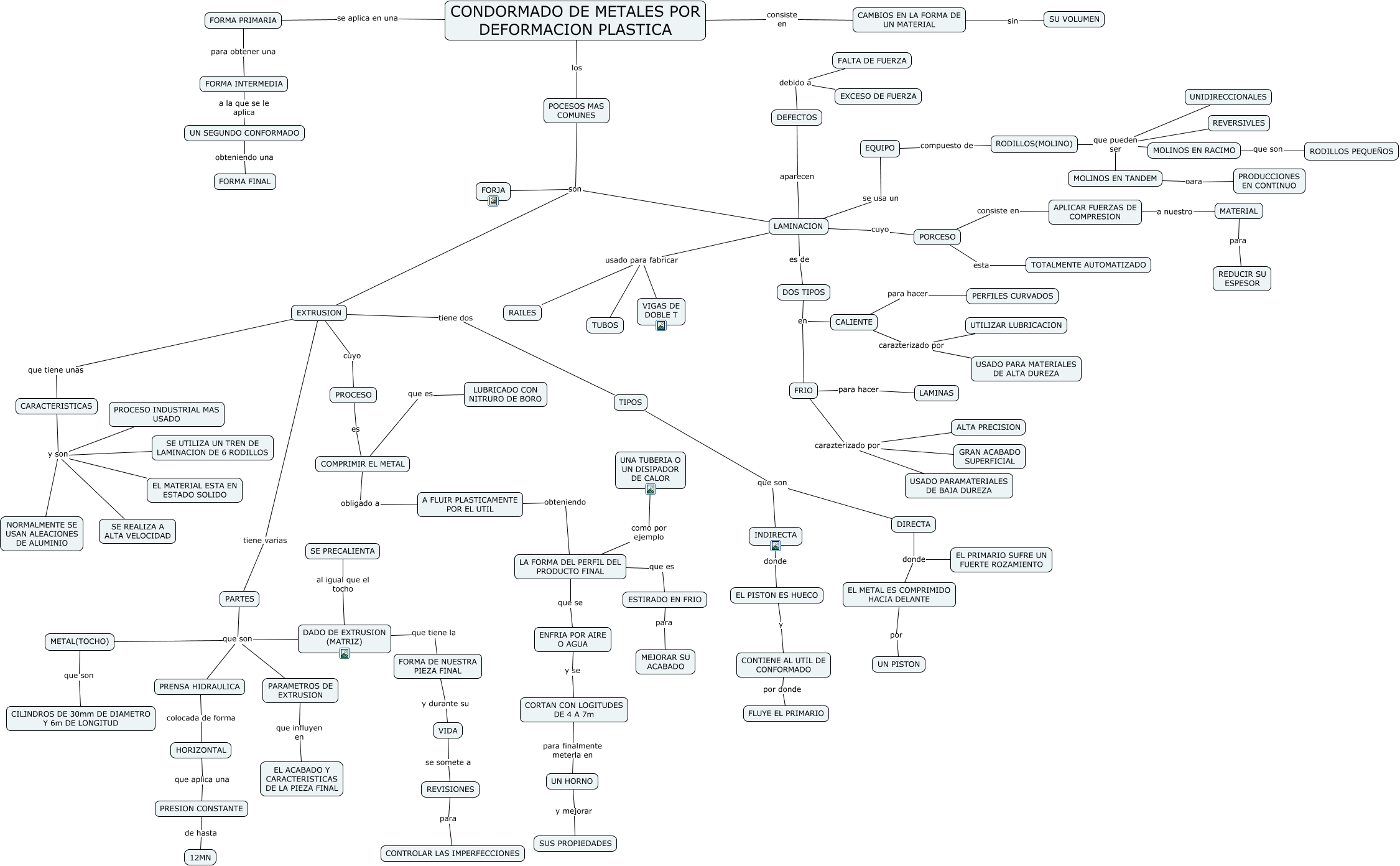 Este Cmap, tiene información relacionada con: Cordomado de metales, FORMA DE NUESTRA PIEZA FINAL y durante su VIDA, EL PISTON ES HUECO y CONTIENE AL UTIL DE CONFORMADO, PARTES que son PARAMETROS DE EXTRUSION, FRIO carazterizado por USADO PARAMATERIALES DE BAJA DUREZA, SE UTILIZA UN TREN DE LAMINACION DE 6 RODILLOS y son SE REALIZA A ALTA VELOCIDAD, EXTRUSION tiene varias PARTES, LAMINACION es de DOS TIPOS, ALTA PRECISION carazterizado por USADO PARAMATERIALES DE BAJA DUREZA, METAL(TOCHO) que son CILINDROS DE 30mm DE DIAMETRO Y 6m DE LONGITUD, UN HORNO y mejorar SUS PROPIEDADES, PARTES que son PRENSA HIDRAULICA, CONTIENE AL UTIL DE CONFORMADO por donde FLUYE EL PRIMARIO, PROCESO es COMPRIMIR EL METAL, EXTRUSION cuyo PROCESO, LAMINACION usado para fabricar TUBOS, TIPOS que son INDIRECTA, PRENSA HIDRAULICA colocada de forma HORIZONTAL, FORMA PRIMARIA para obtener una FORMA INTERMEDIA, PRESION CONSTANTE de hasta 12MN, LAMINACION usado para fabricar VIGAS DE DOBLE T