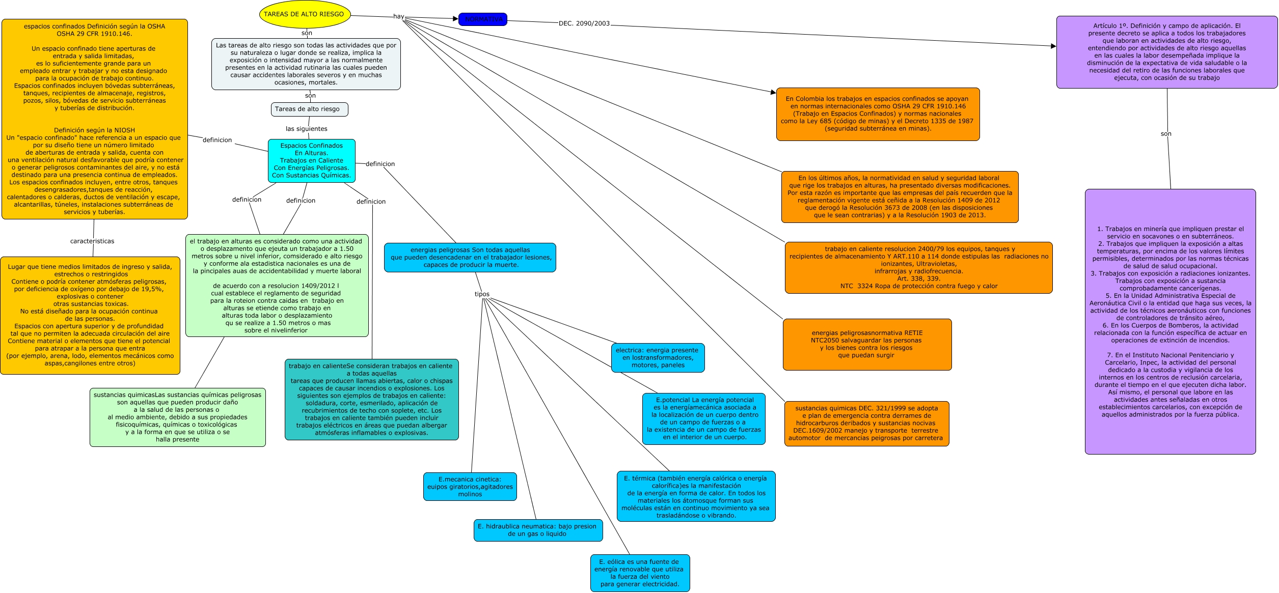 Este Cmap, tiene información relacionada con: Tareas de alto Riesgo, Las tareas de alto riesgo son todas las actividades que por su naturaleza o lugar donde se realiza, implica la exposición o intensidad mayor a las normalmente presentes en la actividad rutinaria las cuales pueden causar accidentes laborales severos y en muchas ocasiones, mortales. son Tareas de alto riesgo, espacios confinados Definición según la OSHA OSHA 29 CFR 1910.146. Un espacio confinado tiene aperturas de entrada y salida limitadas, es lo suficientemente grande para un empleado entrar y trabajar y no esta designado para la ocupación de trabajo continuo. Espacios confinados incluyen bóvedas subterráneas, tanques, recipientes de almacenaje, registros, pozos, silos, bóvedas de servicio subterráneas y tuberías de distribución. Definición según la NIOSH Un "espacio confinado" hace referencia a un espacio que por su diseño tiene un número limitado de aberturas de entrada y salida, cuenta con una ventilación natural desfavorable que podría contener o generar peligrosos contaminantes del aire, y no está destinado para una presencia continua de empleados. Los espacios confinados incluyen, entre otros, tanques desengrasadores,tanques de reacción, calentadores o calderas, ductos de ventilación y escape, alcantarillas, túneles, instalaciones subterráneas de servicios y tuberías. caracteristicas Lugar que tiene medios limitados de ingreso y salida, estrechos o restringidos Contiene o podría contener atmósferas peligrosas, por deficiencia de oxígeno por debajo de 19,5%, explosivas o contener otras sustancias toxicas. No está diseñado para la ocupación continua de las personas. Espacios con apertura superior y de profundidad tal que no permiten la adecuada circulación del aire Contiene material o elementos que tiene el potencial para atrapar a la persona que entra (por ejemplo, arena, lodo, elementos mecánicos como aspas,cangilones entre otros), TAREAS DE ALTO RIESGO hay trabajo en caliente resolucion 2400/79 los equipos, tanques y recipientes de almacenamiento Y ART.110 a 114 donde estipulas las radiaciones no ionizantes, Ultravioletas, infrarrojas y radiofrecuencia. Art. 338, 339. NTC 3324 Ropa de protección contra fuego y calor, TAREAS DE ALTO RIESGO hay En Colombia los trabajos en espacios confinados se apoyan en normas internacionales como OSHA 29 CFR 1910.146 (Trabajo en Espacios Confinados) y normas nacionales como la Ley 685 (código de minas) y el Decreto 1335 de 1987 (seguridad subterránea en minas)., energias peligrosas Son todas aquellas que pueden desencadenar en el trabajador lesiones, capaces de producir la muerte. tipos E.mecanica cinetica: euipos giratorios,agitadores molinos, energias peligrosas Son todas aquellas que pueden desencadenar en el trabajador lesiones, capaces de producir la muerte. tipos E. eólica es una fuente de energía renovable que utiliza la fuerza del viento para generar electricidad., TAREAS DE ALTO RIESGO hay NORMATIVA, TAREAS DE ALTO RIESGO hay sustancias quimicas DEC. 321/1999 se adopta e plan de emergencia contra derrames de hidrocarburos deribados y sustancias nocivas DEC.1609/2002 manejo y transporte terrestre automotor de mercancias peigrosas por carretera, NORMATIVA DEC. 2090/2003 Artículo 1º. Definición y campo de aplicación. El presente decreto se aplica a todos los trabajadores que laboran en actividades de alto riesgo, entendiendo por actividades de alto riesgo aquellas en las cuales la labor desempeñada implique la disminución de la expectativa de vida saludable o la necesidad del retiro de las funciones laborales que ejecuta, con ocasión de su trabajo, Artículo 1º. Definición y campo de aplicación. El presente decreto se aplica a todos los trabajadores que laboran en actividades de alto riesgo, entendiendo por actividades de alto riesgo aquellas en las cuales la labor desempeñada implique la disminución de la expectativa de vida saludable o la necesidad del retiro de las funciones laborales que ejecuta, con ocasión de su trabajo son 1. Trabajos en minería que impliquen prestar el servicio en socavones o en subterráneos. 2. Trabajos que impliquen la exposición a altas temperaturas, por encima de los valores límites permisibles, determinados por las normas técnicas de salud de salud ocupacional. 3. Trabajos con exposición a radiaciones ionizantes. Trabajos con exposición a sustancia comprobadamente cancerígenas. 5. En la Unidad Administrativa Especial de Aeronáutica Civil o la entidad que haga sus veces, la actividad de los técnicos aeronáuticos con funciones de controladores de tránsito aéreo, 6. En los Cuerpos de Bomberos, la actividad relacionada con la función específica de actuar en operaciones de extinción de incendios. 7. En el Instituto Nacional Penitenciario y Carcelario, Inpec, la actividad del personal dedicado a la custodia y vigilancia de los internos en los centros de reclusión carcelaria, durante el tiempo en el que ejecuten dicha labor. Así mismo, el personal que labore en las actividades antes señaladas en otros establecimientos carcelarios, con excepción de aquellos administrados por la fuerza pública., Espacios Confinados En Alturas. Trabajos en Caliente Con Energías Peligrosas. Con Sustancias Químicas. definicion el trabajo en alturas es considerado como una actividad o desplazamento que ejeuta un trabajador a 1.50 metros sobre u nivel inferior, comsiderado e alto riesgo y conforme ala estadistica nacionales es una de la pincipales auas de accidentabilidad y muerte laboral de acuerdo con a resolucion 1409/2012 l cual establece el reglamento de seguridad para la roteion contra caidas en trabajo en alturas se etiende como trabajo en alturas toda labor o desplazamiento qu se realize a 1.50 metros o mas sobre el nivelinferior, energias peligrosas Son todas aquellas que pueden desencadenar en el trabajador lesiones, capaces de producir la muerte. tipos electrica: energia presente en lostransfo