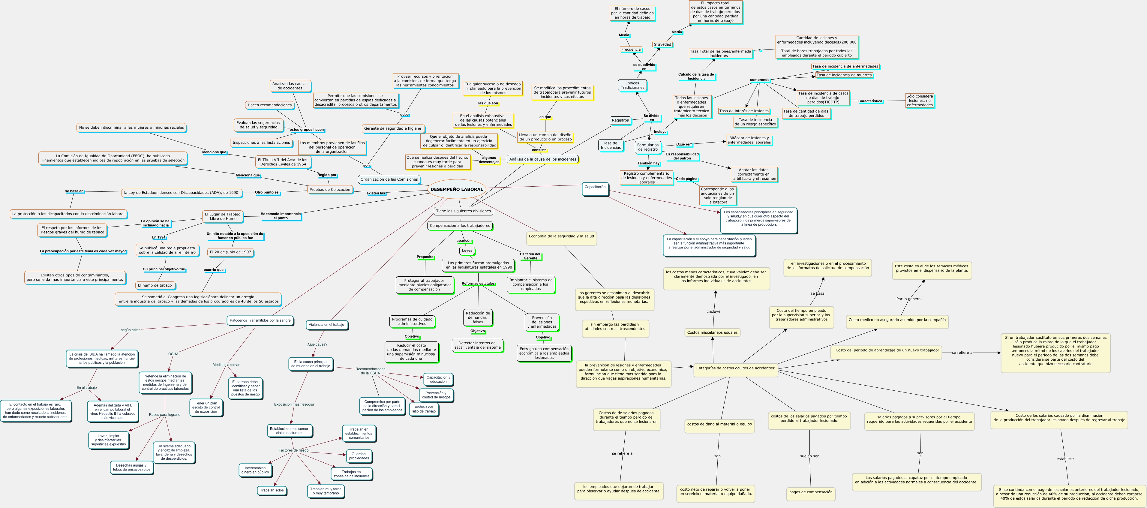 Este Cmap, tiene información relacionada con: DESEMPEÑO LABORAL, Formularios de registro ¿Qué es? Bitácora de lesiones y enfermedades laborales, Es la causa principal de muertes en el trabajo Recomendaciones de la OSHA Capacitación y educación, la Ley de Estadounidenses con Discapacidades (ADA), de 1990 se basa en La protección a los dicapacitados con la discriminación laboral, Pruebas de Colocación Regido por El Título VII del Acta de los Derechos Civiles de 1964, Organización de las Comisiones ???? DESEMPEÑO LABORAL, El Título VII del Acta de los Derechos Civiles de 1964 Menciona que No se deben discriminar a las mujeres o minorías raciales, El Lugar de Trabajo Libre de Humo En 1994 Se publicó una regla propuesta sobre la calidad de aire interiro, Se publicó una regla propuesta sobre la calidad de aire interiro Su principal objetivo fue El humo de tabaco, Es la causa principal de muertes en el trabajo Recomendaciones de la OSHA Prevención y control de riesgos, Formularios de registro También hay Registro complementario de lesiones y enfermedades laborales, Costos de de salarios pagados durante el tiempo perdido de trabajadores que no se lesionaron se refiere a los empleados que dejaron de trabajar para observar o ayudar después delaccidente, Pruebas de Colocación Menciona que La Comisión de Igualdad de Oportunidad (EEOC), ha publicado linamientos que establecen índices de repobración en las pruebas de selección, Todas las lesiones o enfermedades que requieren tratamiento técnico más los decesos comprende Tasa de cantidad de días de trabajo perdidos, Los miembros provienen de las filas del personal de operacion de la organizacion estos grupos hacen Evaluan las sugerencias de salud y seguridad, Tasa de Incidencias Incluye Todas las lesiones o enfermedades que requieren tratamiento técnico más los decesos, Formularios de registro Es responsabilidad del patrón Anotar los datos correctamente en la bitácora y el resumen, Costo del periodo de aprendizaje de un nuevo trabajador se refiere a Si un trabajador sustituto en sus primeras dos semanas sólo produce la mitad de lo que el trabajador lesionado hubiera producido por el mismo pago ,entonces la mitad de los salarios del trabajador nuevo para el periodo de las dos semanas debe considerarse parte del costo del accidente que hizo necesario contratarlo, Establecimientos comer- ciales nocturnos Factores de riesgo Intercambian dinero en público, Tasa Total de lesiones/enfermeda incidentes = Cantidad de lesiones y enfermedades incluyendo decesosX200,000 ___________________________________ Total de horas trabajadas por todos los empleados durante el periodo cubierto, Establecimientos comer- ciales nocturnos Factores de riesgo Trabajan en establecimientos comunitarios