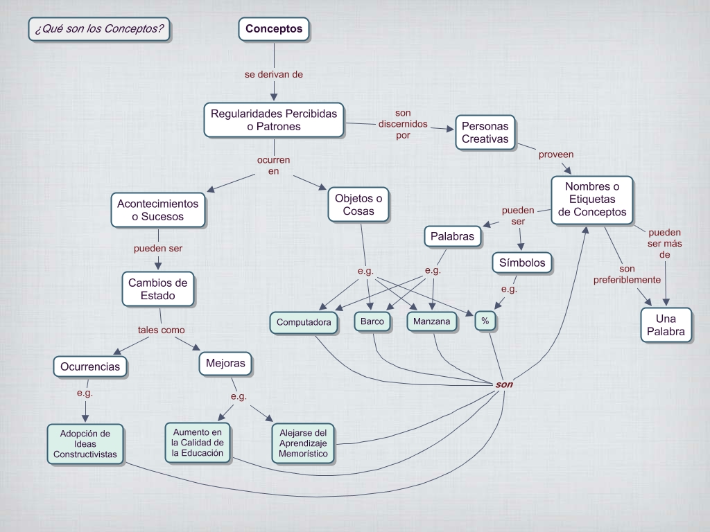 This Concept Map, created with IHMC CmapTools, has information related to: Conceptos, Conceptos se derivan de Regularidades Percibidas o Patrones, Regularidades Percibidas o Patrones son discernidos por Personas Creativas, Alejarse del Aprendizaje Memorístico son Nombres o Etiquetas de Conceptos, Regularidades Percibidas o Patrones ocurren en Objetos o Cosas, Ocurrencias e.g. Adopción de Ideas Constructivistas, Palabras e.g. Computadora, Personas Creativas proveen Nombres o Etiquetas de Conceptos, Palabras e.g. Barco, Símbolos e.g. %, Regularidades Percibidas o Patrones ocurren en Acontecimientos o Sucesos, Cambios de Estado tales como Ocurrencias, Nombres o Etiquetas de Conceptos son preferiblemente Una Palabra, Objetos o Cosas e.g. Manzana, Barco son Nombres o Etiquetas de Conceptos, Adopción de Ideas Constructivistas son Nombres o Etiquetas de Conceptos, Acontecimientos o Sucesos pueden ser Cambios de Estado, Aumento en la Calidad de la Educación son Nombres o Etiquetas de Conceptos, Manzana son Nombres o Etiquetas de Conceptos, Mejoras e.g. Aumento en la Calidad de la Educación, Nombres o Etiquetas de Conceptos pueden ser Palabras