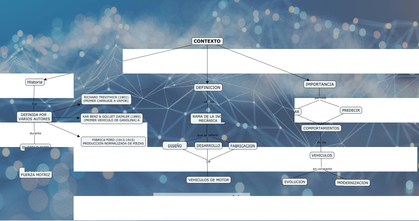 Este Cmap, tiene información relacionada con: CONTEXTO, VEHICULOS en constante EVOLUCION, DISEÑO DE VEHICULOS DE MOTOR, DEFINICION es una RAMA DE LA ING. MECÁNICA, DEFINIDA POR VARIOS AUTORES durante EL SIGLO XVIII, ANALIZAR COMPORTAMIENTOS, DEFINIDA POR VARIOS AUTORES FABRICA FORD (1913-1915) PRODUCCION NORMALIZADA DE PIEZAS, EL SIGLO XVIII en el intento DE OBTENER FUERZA MOTRIZ, IMPORTANCIA permite PREDECIR, DEFINIDA POR VARIOS AUTORES KAR BENZ & GOLLIET DAIMLER (1885) (PRIMER VEHICULO DE GASOLINA) A, COMPORTAMIENTOS de los VEHICULOS, DEFINIDA POR VARIOS AUTORES RICHARD TREVITHICK (1801) (PRIMER CARRUAJE A VAPOR), FABRICACION DE VEHICULOS DE MOTOR, CONTEXTO DEFINICION, Historia fue DEFINIDA POR VARIOS AUTORES, DESARROLLO DE VEHICULOS DE MOTOR, IMPORTANCIA permite ANALIZAR, CONTEXTO Historia, RAMA DE LA ING. MECÁNICA que se refiere FABRICACION, RAMA DE LA ING. MECÁNICA que se refiere DESARROLLO, RAMA DE LA ING. MECÁNICA que se refiere DISEÑO