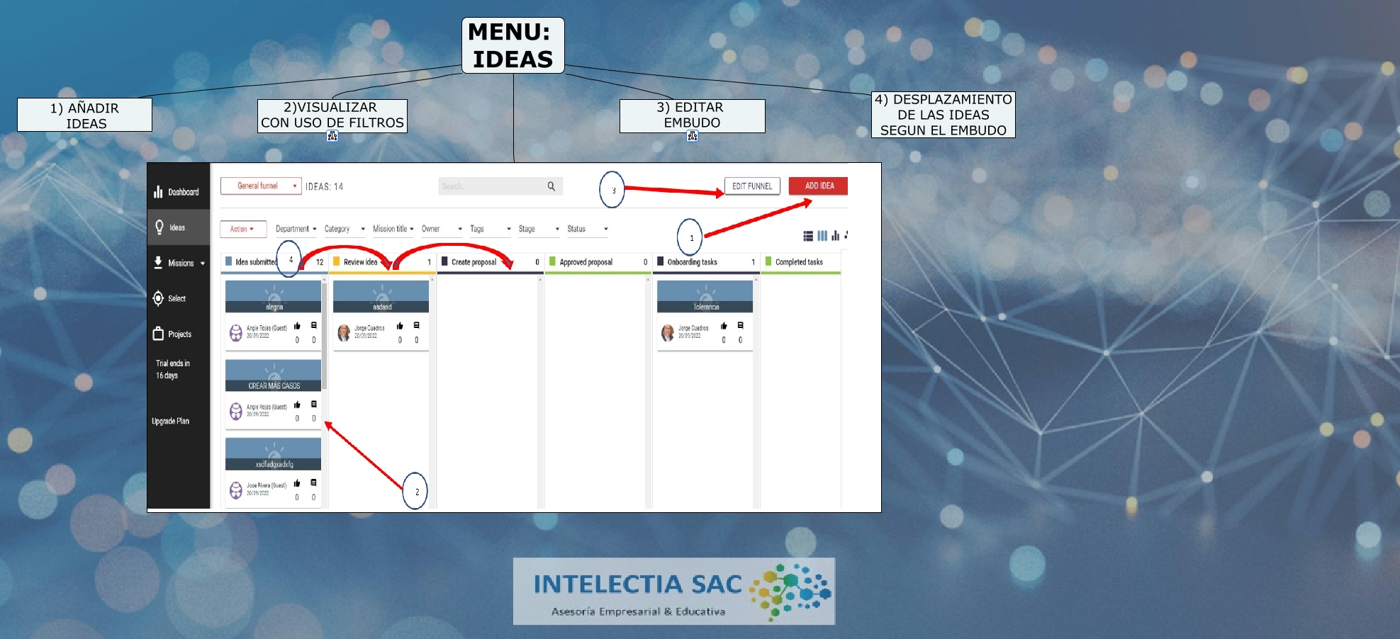 Este Cmap, tiene información relacionada con: IDEAS, MENU: IDEAS 2)VISUALIZAR CON USO DE FILTROS, MENU: IDEAS 3) EDITAR EMBUDO, MENU: IDEAS 4) DESPLAZAMIENTO DE LAS IDEAS SEGUN EL EMBUDO, MENU: IDEAS, MENU: IDEAS 1) AÑADIR IDEAS