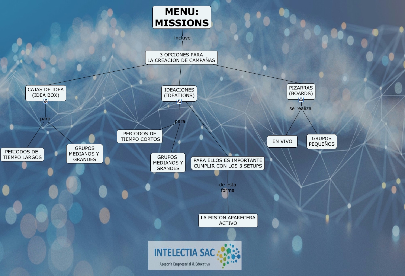 Este Cmap, tiene información relacionada con: MISIONES, CAJAS DE IDEA (IDEA BOX) para PERIODOS DE TIEMPO LARGOS, 3 OPCIONES PARA LA CREACION DE CAMPAÑAS PIZARRAS (BOARDS), PIZARRAS (BOARDS) se realiza EN VIVO, CAJAS DE IDEA (IDEA BOX) para GRUPOS MEDIANOS Y GRANDES, PARA ELLOS ES IMPORTANTE CUMPLIR CON LOS 3 SETUPS de esta forma LA MISION APARECERA ACTIVO, PIZARRAS (BOARDS) se realiza GRUPOS PEQUEÑOS, IDEACIONES (IDEATIONS) para GRUPOS MEDIANOS Y GRANDES, 3 OPCIONES PARA LA CREACION DE CAMPAÑAS IDEACIONES (IDEATIONS), 3 OPCIONES PARA LA CREACION DE CAMPAÑAS CAJAS DE IDEA (IDEA BOX), IDEACIONES (IDEATIONS) para PERIODOS DE TIEMPO CORTOS, IDEACIONES (IDEATIONS) PARA ELLOS ES IMPORTANTE CUMPLIR CON LOS 3 SETUPS, MENU: MISSIONS incluye 3 OPCIONES PARA LA CREACION DE CAMPAÑAS