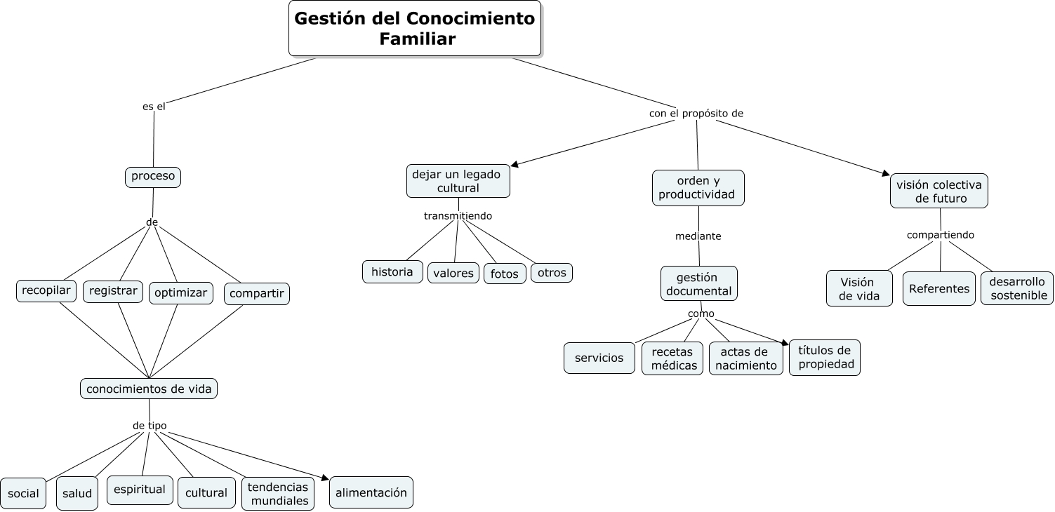 Este Cmap, tiene información relacionada con: Gestión del Conocimiento Familiar, conocimientos de vida de tipo alimentación, conocimientos de vida de tipo salud, proceso de optimizar, Gestión del Conocimiento Familiar es el proceso, gestión documental como recetas médicas, conocimientos de vida de tipo social, proceso de recopilar, Gestión del Conocimiento Familiar con el propósito de dejar un legado cultural, conocimientos de vida de tipo cultural, gestión documental como actas de nacimiento, visión colectiva de futuro compartiendo Visión de vida, dejar un legado cultural transmitiendo otros, visión colectiva de futuro compartiendo desarrollo sostenible, conocimientos de vida de tipo espiritual, compartir conocimientos de vida, gestión documental como servicios, recopilar conocimientos de vida, proceso de registrar, gestión documental como títulos de propiedad, optimizar conocimientos de vida