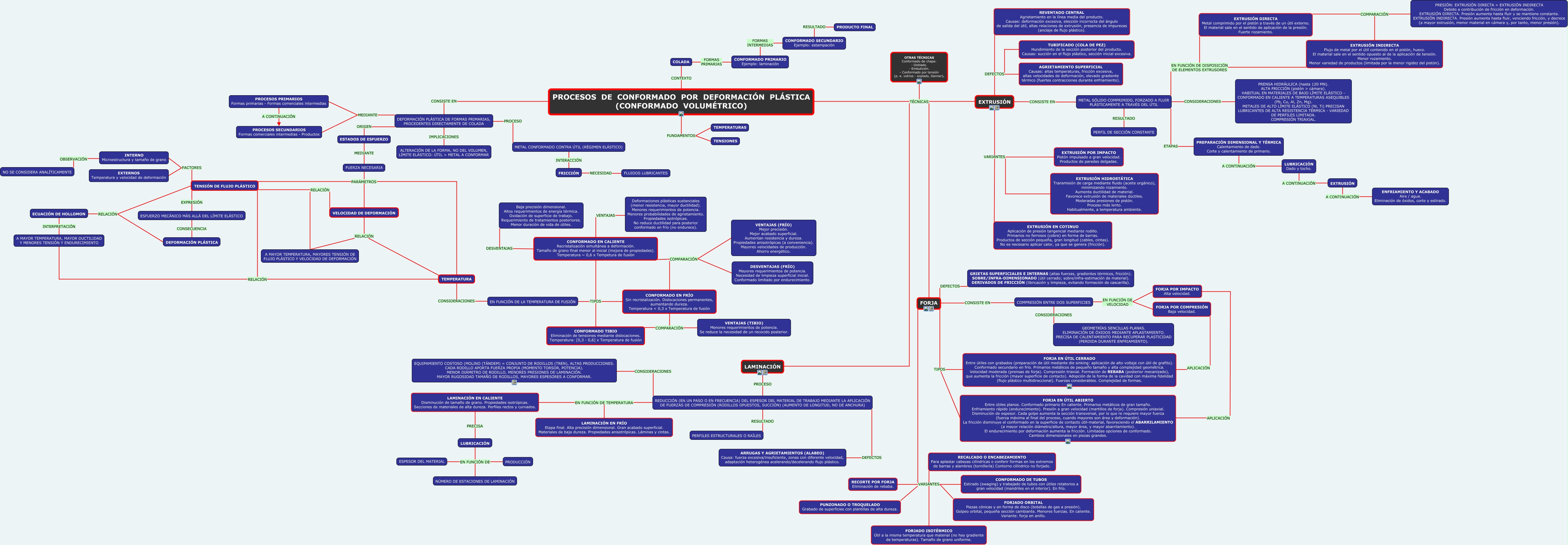 Este Cmap, tiene información relacionada con: María Elena Ferradás Echeveste, EXTRUSIÓN DEFECTOS AGRIETAMIENTO SUPERFICIAL Causas: altas temperaturas, fricción excesiva, altas velocidades de deformación, elevado gradiente térmico (fuertes contracciones durante enfriamiento)., ESTADOS DE ESFUERZO MEDIANTE FUERZA NECESARIA, COMPRESIÓN ENTRE DOS SUPERFICIES EN FUNCIÓN DE VELOCIDAD FORJA POR IMPACTO Alta velocidad., INTERNO Microestructura y tamaño de grano OBSERVACIÓN NO SE CONSIDERA ANAL�?TICAMENTE, FORJA VARIANTES RECORTE POR FORJA Eliminación de rebaba., EN FUNCIÓN DE LA TEMPERATURA DE FUSIÓN TIPOS CONFORMADO TIBIO Eliminación de tensiones mediante dislocaciones. Temperatura: [0,3 - 0,6] x Temperatura de fusión, EXTRUSIÓN A CONTINUACIÓN ENFRIAMIENTO Y ACABADO Aire / agua. Eliminación de óxidos, corte y estirado., ECUACIÓN DE HOLLOMON INTERPRETACIÓN A MAYOR TEMPERATURA, MAYOR DUCTILIDAD Y MENORES TENSIÓN Y ENDURECIMIENTO, EXTRUSIÓN DEFECTOS REVENTADO CENTRAL Agrietamiento en la línea media del producto. Causas: deformación excesiva, elección incorrecta del ángulo de salida del útil, altas relaciones de extrusión, presencia de impurezas (anclaje de flujo plástico)., REDUCCIÓN (EN UN PASO O EN FRECUENCIA) DEL ESPESOR DEL MATERIAL DE TRABAJO MEDIANTE LA APLICACIÓN DE FUERZAS DE COMPRESIÓN (RODILLOS OPUESTOS, SUCCIÓN) (AUMENTO DE LONGITUD, NO DE ANCHURA) EN FUNCIÓN DE TEMPERATURA LAMINACIÓN EN FR�?O Etapa final. Alta precisión dimensional. Gran acabado superficial. Materiales de baja dureza. Propiedades anisotrópicas. Láminas y cintas., FUERZA NECESARIA PAR�?METROS TEMPERATURA, FORJA VARIANTES PUNZONADO O TROQUELADO Grabado de superficies con plantillas de alta dureza., PROCESOS DE CONFORMADO POR DEFORMACIÓN PL�?STICA (CONFORMADO VOLUMÉTRICO) CONSISTE EN DEFORMACIÓN PL�?STICA DE FORMAS PRIMARIAS, PROCEDENTES DIRECTAMENTE DE COLADA, EXTRUSIÓN VARIANTES EXTRUSIÓN POR IMPACTO Pistón impulsado a gran velocidad. Productos de paredes delgadas., FORJA POR COMPRESIÓN Baja velocidad. APLICACIÓN FORJA EN ÚTIL CERRADO Entre útiles con grabados (preparación de útil mediante die sinking: aplicación de alto voltaje con útil de grafito). Conformado secundario en frío. Primarios metálicos de pequeño tamaño y alta complejidad geométrica. Velocidad moderada (prensas de forja). Compresión triaxial. Formación de REBABA (posterior mecanizado), que aumenta la fricción (mayor superficie de contacto). Adopción de la forma de la cavidad con máxima fidelidad (flujo plástico multidireccional). Fuerzas considerables. Complejidad de formas., EXTRUSIÓN VARIANTES EXTRUSIÓN EN COTINUO Aplicación de presión tangencial mediante rodillo. Primarios no ferrosos (cobre) en forma de barras. Productos de sección pequeña, gran longitud (cables, cintas). No es necesario aplicar calor, ya que se genera (fricción)., CONFORMADO EN CALIENTE Recristalización simultánea a deformación. Tamaño de grano final menor al inicial (mejora de propiedades). Temperatura ~ 0,6 x Tempetura de fusión DESVENTAJAS Baja precisión dimensional. Altos requerimientos de energía térmica. Oxidación de superficie de trabajo. Requerimiento de tratamientos posteriores. Menor duración de vida de útiles., REDUCCIÓN (EN UN PASO O EN FRECUENCIA) DEL ESPESOR DEL MATERIAL DE TRABAJO MEDIANTE LA APLICACIÓN DE FUERZAS DE COMPRESIÓN (RODILLOS OPUESTOS, SUCCIÓN) (AUMENTO DE LONGITUD, NO DE ANCHURA) DEFECTOS ARRUGAS Y AGRIETAMIENTOS (ALABEO) Causa: fuerza excesiva/insuficiente, zonas con diferente velocidad, adaptación heterogénea acelerando/decelerando flujo plástico., FORJA VARIANTES CONFORMADO DE TUBOS Estirado (swaging) y trabajado de tubos con útiles rotatorios a gran velocidad (mandriles en el interior). En frío., METAL SÓLIDO COMPRIMIDO, FORZADO A FLUIR PL�?STICAMENTE A TRAVÉS DEL ÚTIL CONSIDERACIONES PRENSA HIDR�?ULICA (hasta 120 MN). ALTA FRICCIÓN (pistón > cámara). HABITUAL EN MATERIALES DE BAJO L�?MITE EL�?STICO - CONFORMADO EN CALIENTE A TEMPERATURAS ASEQUIBLES (Pb, Cu, Al, Zn, Mg). METALES DE ALTO L�?MITE EL�?STICO (Ni, Ti) PRECISAN LUBRICANTES DE ALTA RESISTENCIA TÉRMICA - VARIEDAD DE PERFILES LIMITADA. COMPRESIÓN TRIAXIAL.