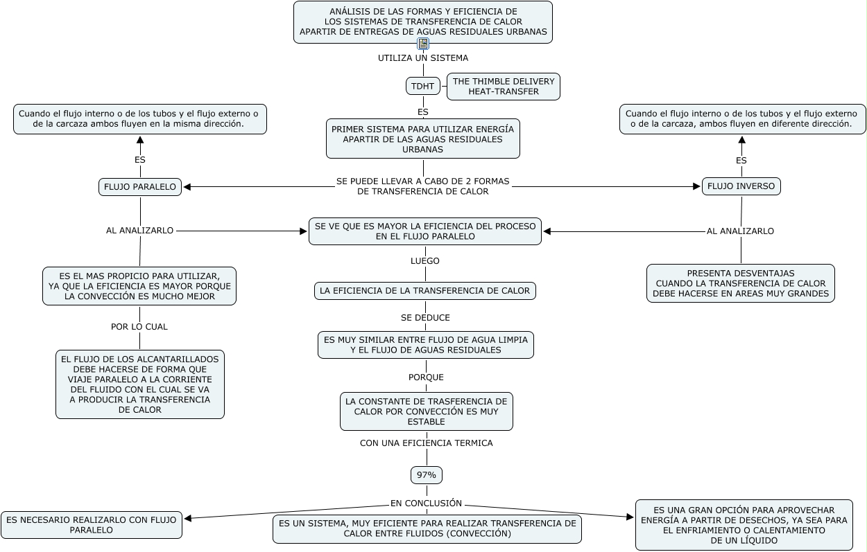 Este Cmap, tiene información relacionada con: MAPA TRANSFERENCIA, LA CONSTANTE DE TRASFERENCIA DE CALOR POR CONVECCIÓN ES MUY ESTABLE CON UNA EFICIENCIA TERMICA 97%, TDHT ES PRIMER SISTEMA PARA UTILIZAR ENERG�?A APARTIR DE LAS AGUAS RESIDUALES URBANAS, FLUJO PARALELO AL ANALIZARLO SE VE QUE ES MAYOR LA EFICIENCIA DEL PROCESO EN EL FLUJO PARALELO, FLUJO INVERSO AL ANALIZARLO SE VE QUE ES MAYOR LA EFICIENCIA DEL PROCESO EN EL FLUJO PARALELO, AN�?LISIS DE LAS FORMAS Y EFICIENCIA DE LOS SISTEMAS DE TRANSFERENCIA DE CALOR APARTIR DE ENTREGAS DE AGUAS RESIDUALES URBANAS UTILIZA UN SISTEMA TDHT, PRIMER SISTEMA PARA UTILIZAR ENERG�?A APARTIR DE LAS AGUAS RESIDUALES URBANAS SE PUEDE LLEVAR A CABO DE 2 FORMAS DE TRANSFERENCIA DE CALOR FLUJO PARALELO, ES EL MAS PROPICIO PARA UTILIZAR, YA QUE LA EFICIENCIA ES MAYOR PORQUE LA CONVECCIÓN ES MUCHO MEJOR POR LO CUAL EL FLUJO DE LOS ALCANTARILLADOS DEBE HACERSE DE FORMA QUE VIAJE PARALELO A LA CORRIENTE DEL FLUIDO CON EL CUAL SE VA A PRODUCIR LA TRANSFERENCIA DE CALOR, PRIMER SISTEMA PARA UTILIZAR ENERG�?A APARTIR DE LAS AGUAS RESIDUALES URBANAS SE PUEDE LLEVAR A CABO DE 2 FORMAS DE TRANSFERENCIA DE CALOR FLUJO INVERSO, 97% EN CONCLUSIÓN ES UNA GRAN OPCIÓN PARA APROVECHAR ENERG�?A A PARTIR DE DESECHOS, YA SEA PARA EL ENFRIAMIENTO O CALENTAMIENTO DE UN L�?QUIDO, FLUJO INVERSO ES Cuando el flujo interno o de los tubos y el flujo externo o de la carcaza, ambos fluyen en diferente dirección., FLUJO INVERSO AL ANALIZARLO PRESENTA DESVENTAJAS CUANDO LA TRANSFERENCIA DE CALOR DEBE HACERSE EN AREAS MUY GRANDES, ES MUY SIMILAR ENTRE FLUJO DE AGUA LIMPIA Y EL FLUJO DE AGUAS RESIDUALES PORQUE LA CONSTANTE DE TRASFERENCIA DE CALOR POR CONVECCIÓN ES MUY ESTABLE, LA EFICIENCIA DE LA TRANSFERENCIA DE CALOR SE DEDUCE ES MUY SIMILAR ENTRE FLUJO DE AGUA LIMPIA Y EL FLUJO DE AGUAS RESIDUALES, TDHT ES THE THIMBLE DELIVERY HEAT-TRANSFER, SE VE QUE ES MAYOR LA EFICIENCIA DEL PROCESO EN EL FLUJO PARALELO LUEGO LA EFICIENCIA DE LA TRANSFERENCIA DE CALOR, FLUJO PARALELO AL ANALIZARLO ES EL MAS PROPICIO PARA UTILIZAR, YA QUE LA EFICIENCIA ES MAYOR PORQUE LA CONVECCIÓN ES MUCHO MEJOR, 97% EN CONCLUSIÓN ES NECESARIO REALIZARLO CON FLUJO PARALELO, 97% EN CONCLUSIÓN ES UN SISTEMA, MUY EFICIENTE PARA REALIZAR TRANSFERENCIA DE CALOR ENTRE FLUIDOS (CONVECCIÓN), FLUJO PARALELO ES Cuando el flujo interno o de los tubos y el flujo externo o de la carcaza ambos fluyen en la misma dirección.