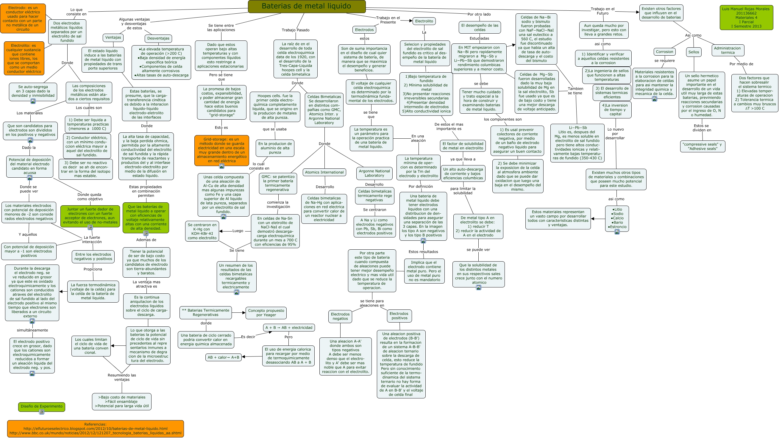 Este Cmap, tiene información relacionada con: materiales 4- I parcial, El desempeño de las celdas Estudiadas En MIT empezaron con Na−Bi pero rapidamente migraron a Mg−Sb y Li−Pb−Sb que demostraron rendimiento columbicas superiores y a menor costo., Baterias de metal liquido Trabajo en el Presente Electrodos, Celdas Bimetalicas Se desarrollaron en distintos com- pañias como GMC, Atomics Inter. y Argonne National Laboratory Donde GMC: se patentizo la primer batería termicamente regenerativa, Es la continua aniquilacion de los electrodos liquidos sobre el ciclo de carga- descarga. ???? Lo que otorga a las baterias la potencial de ciclo de vida sin precedentes al repre sentarlos inmunes a mecanismo de degra cion de la microestruc tura del electrodo., Baterias de metal liquido Algunas ventajas y desventajas de estos Ventajas, Hoopes cells. fue la primer celda electro- química completamente liquida, que se origino en la producion de metales de alta pureza. que se usaba En la producion de aluminio de alta pureza, Que son candidatos para electrodos son divididos en los positivos y negativos Dado la Potencial de deposición del material electrodo candidato en forma acuosa, 1) Debe ser liquida a temperaturas practicas (menores a 1000 C) ???? 2) Conductor eléctrico, con un mínimo condu- ccion eléctrica mayor a aquel del electrolito de sal fundido., Baterias de metal liquido Trabajo Pasado La raíz de en el desarrollo de toda celda electroquimica data de los 1920, con el desarrollo de la Tres-Capa-Liquida hoopes cell y la celda bimetalica, ∙Litio ∙Sodio ∙Calcio ∙Bario ∙Estroncio ???? Estos materiales representan un vasto campo por desarrollar todos con caracteristicas distintas y ventajas., Entre los electrodos negativos y positivos Propiciona La fuerza termodinámica (voltaje de la celda) para la celda de la batería de metal liquida., Las composiciones de los electrodos metálicos están ata- dos a ciertos requisitos Los cuales son 1) Debe ser liquida a temperaturas practicas (menores a 1000 C), El estado liquido induce a las baterías de metal liquido con propiedades de trans porte superiores ???? Estas baterías, se presume, que la carga- transferencia cinética es debido a la interacion liquido-liquido electrodo-eletrolito de las interfaces, Dado que estos operan bajo altas temperaturas y con componentes líquidos esto restringe a aplicaciones estacionarias Pero se tiene que La promesa de bajos costos, expansibilidad, y poder almacenar gran cantidad de energía hace estos buenos candidatos para "grid-storage", Con potencial de deposición mayor a -1 son electrodos positivos La fuerte interacción Entre los electrodos negativos y positivos, Electrolito La Selecion y propiedades del electrolito de sal fundido es critico al des- empeño de la batería de metal liquido, De metal tipo A en electrolito se debe: 1) reducir T 2) reducir la actividad de A en el electrodo se puede ver Que la solubilidad de los distintos metales en sus respectivos sales crece junto con el numero atomico, Los materiales electrodos con potencial de deposición menores de -2 son conside rados electrodos negativos Y aquellos Con potencial de deposición mayor a -1 son electrodos positivos, Existen otros factores que influyen en el desarrollo de baterias Asi como Sellos, Existen muchos otros tipos de materiales y combinaciones que poseen mucho potencial para este estudio. asi como ∙Litio ∙Sodio ∙Calcio ∙Bario ∙Estroncio