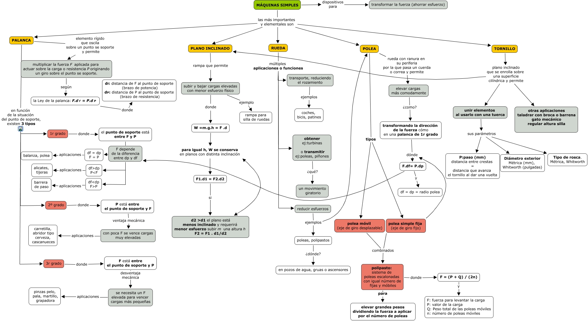 Aquest mapa conceptual conté informació relacionada amb: preguntaenfoc2 tfm, PALANCA en función de la situación del punto de soporte, existen 3 tipos 1r grado, F está entre el punto de soporte y P desventaja mecánica se necesita un F elevada para vencer cargas más pequeñas, 2º grado donde P está entre el punto de soporte y F, subir y bajar cargas elevadas con menor esfuerzo físico donde W =m.g.h = F .d, RUEDA múltiples aplicaciones o funciones reducir esfuerzos, PLANO INCLINADO rampa que permite subir y bajar cargas elevadas con menor esfuerzo físico, P está entre el punto de soporte y F ventaja mecánica con poca F se vence cargas muy elevadas, F.df= P.dp F depende de la diferencia entre dp y df df = dp F = P, F.df= P.dp F depende de la diferencia entre dp y df df<dp F>P, polipasto: sistema de poleas escalonadas con igual número de fijas y móbiles donde F = (P + Q) / (2n), transformando la dirección de la fuerza cómo en una palanca de 1r grado dónde F.df= P.dp, F.df= P.dp y df = dp = radio polea, polipasto: sistema de poleas escalonadas con igual número de fijas y móbiles para elevar grandes pesos dividiendo la fuerza a aplicar por el número de poleas, con poca F se vence cargas muy elevadas aplicaciones carretilla, abridor tipo cerveza, cascanueces, PALANCA en función de la situación del punto de soporte, existen 3 tipos 2º grado, PALANCA elemento rígido que oscila sobre un punto se soporte y permite multiplicar la fuerza F aplicada para actuar sobre la carga o resistencia Poriginando un giro sobre el punto se soporte., M�?QUINAS SIMPLES las más importantes y elementales son TORNILLO, reducir esfuerzos ejemplos POLEA, polea móvil (eje de giro desplazable) combinados polipasto: sistema de poleas escalonadas con igual número de fijas y móbiles, el punto de soporte está entre F y P F depende de la diferencia entre dp y df df = dp F = P