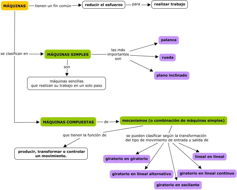Aquest mapa conceptual conté informació relacionada amb: máquinas, mecanismos (o combinación de máquinas simples) se pueden clasificar según la transformación del tipo de movimiento de entrada y salida de giratorio en oscilante, M�?QUINAS SIMPLES son máquinas sencillas que realizan su trabajo en un solo paso, M�?QUINAS se clasifican en M�?QUINAS COMPUESTAS, M�?QUINAS tienen un fin común reducir el esfuerzo, mecanismos (o combinación de máquinas simples) se pueden clasificar según la transformación del tipo de movimiento de entrada y salida de lineal en lineal, M�?QUINAS COMPUESTAS de mecanismos (o combinación de máquinas simples), mecanismos (o combinación de máquinas simples) se pueden clasificar según la transformación del tipo de movimiento de entrada y salida de giratorio en giratorio, M�?QUINAS se clasifican en M�?QUINAS SIMPLES, reducir el esfuerzo para realizar trabajo, mecanismos (o combinación de máquinas simples) que tienen la función de producir, transformar o controlar un movimiento., mecanismos (o combinación de máquinas simples) se pueden clasificar según la transformación del tipo de movimiento de entrada y salida de giratorio en lineal alternativo, mecanismos (o combinación de máquinas simples) se pueden clasificar según la transformación del tipo de movimiento de entrada y salida de giratorio en lineal continuo, M�?QUINAS SIMPLES las más importantes son rueda, M�?QUINAS SIMPLES las más importantes son palanca, M�?QUINAS SIMPLES las más importantes son plano inclinado