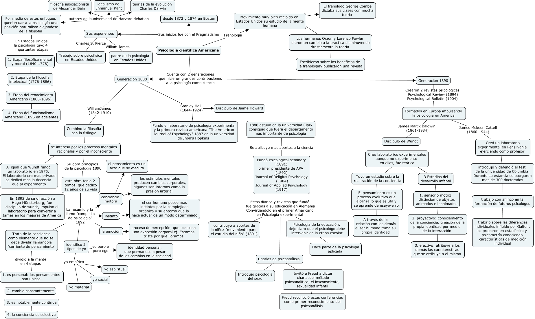 Este Cmap, tiene información relacionada con: psicologia cientifica americana, Charlas de psicoanálisis ???? Invitó a Freud a dictar charlasdel método psicoanalítico, el insconsciente, sexualidad infantil, El pensamiento es un proceso evolutivo que alcanza lo que es útil y se aprende de esayo-error ???? A través de la relación con los demás el ser humano toma su propia identidad, identifico 2 tipos de yo yo empírico yo material, se intereso por los procesos mentales racionales y por el inconsciente Su obra principios de la psicología 1890 esta obra tenia 2 tomos, que dedico 12 años de su vida, Movimiento muy bien recibido en Estados Unidos su estudio de la mente humana ???? El frenólogo George Combe dictaba sus clases con mucha teoría, Psicología científica Americana Cuenta con 2 generaciones que hicieron grandes contribuciones a la psicología como ciencia Generación 1880, 1888 estuvo en la universidad Clark consiguio que fuera el departamento mas importante de psicología Se atribuye mas aportes a la ciencia Fundó Psicological seminary (1891) primer presidente de APA (1892) Journal of Religius Psychology (1904) Journal of Applied Psychology (1917), 1. es personal: los pensamientos son unicos ???? 2. cambia constantemente, la emoción ???? proceso de percepción, que ocasiona una expresión corporal ej. Estamos triste por que lloramos, Fundó Psicological seminary (1891) primer presidente de APA (1892) Journal of Religius Psychology (1904) Journal of Applied Psychology (1917) Estos diarios y revistas que fundó fue gracias a su educación en Alemania Convirtiendolo en el primer Amaricano en Psicología experimental Charlas de psicoanálisis, 1. Etapa filosófica mental y moral (1640-1776) ???? 2. Etapa de la filosofía intelectual (1776-1886), esta obra tenia 2 tomos, que dedico 12 años de su vida La resumio y la llamo "compedio de psicologia" 1892 instinto, Generación 1880 WilliamJames (1842-1910) Combino la filosofía con la fisilogía, Generación 1880 Stanley Hall (1844-1924) Discipulo de Jaime Howard, Combino la filosofía con la fisilogía ???? se intereso por los procesos mentales racionales y por el inconsciente, Psicología científica Americana Frenología Movimiento muy bien recibido en Estados Unidos su estudio de la mente humana, conciencia motora ???? los estímulos mentales producen cambios corporales, algunos son internos como la presión arterial, Psicología científica Americana Sus inicios fue con el Pragmatismo desde 1872 y 1874 en Boston, Invitó a Freud a dictar charlasdel método psicoanalítico, el insconsciente, sexualidad infantil ???? Freud reconoció estas conferencias como primer reconocimiento del psicoanálisis, esta obra tenia 2 tomos, que dedico 12 años de su vida La resumio y la llamo "compedio de psicologia" 1892 conciencia motora