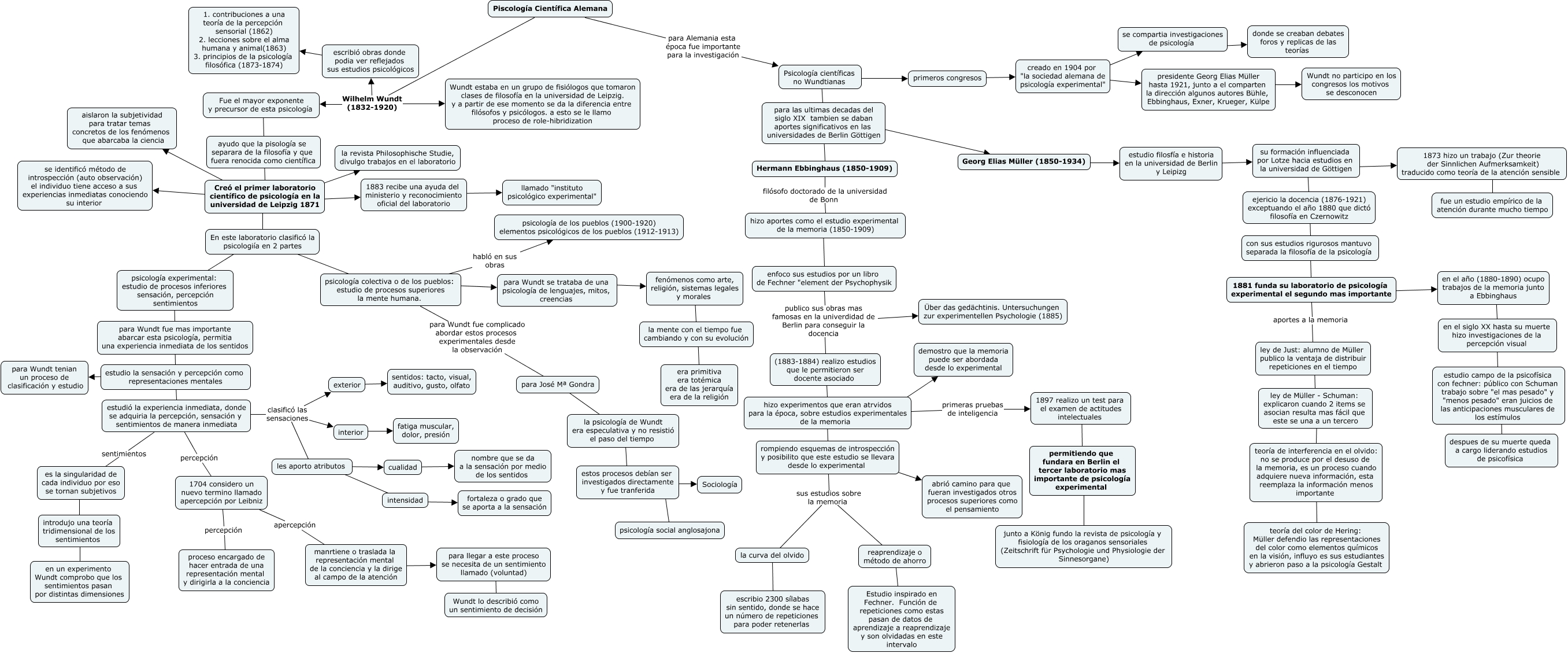Este Cmap, tiene información relacionada con: psicologia cientifica alemana, 1881 funda su laboratorio de psicología experimental el segundo mas importante ???? en el año (1880-1890) ocupo trabajos de la memoria junto a Ebbinghaus, estudió la experiencia inmediata, donde se adquiria la percepción, sensación y sentimientos de manera inmediata sentimientos es la singularidad de cada individuo por eso se tornan subjetivos, escribió obras donde podia ver reflejados sus estudios psicológicos ???? 1. contribuciones a una teoría de la percepción sensorial (1862) 2. lecciones sobre el alma humana y animal(1863) 3. principios de la psicología filosófica (1873-1874), con sus estudios rigurosos mantuvo separada la filosofía de la psicología ???? 1881 funda su laboratorio de psicología experimental el segundo mas importante, Psicología científicas no Wundtianas ???? para las ultimas decadas del siglo XIX tambien se daban aportes significativos en las universidades de Berlin Göttigen, para Wundt se trataba de una psicología de lenguajes, mitos, creencias ???? fenómenos como arte, religión, sistemas legales y morales, es la singularidad de cada individuo por eso se tornan subjetivos ???? introdujo una teoría tridimensional de los sentimientos, 1873 hizo un trabajo (Zur theorie der Sinnlichen Aufmerksamkeit) traducido como teoría de la atención sensible ???? fue un estudio empírico de la atención durante mucho tiempo, estos procesos debían ser investigados directamente y fue tranferida ???? psicología social anglosajona, Piscología Científica Alemana Wilhelm Wundt (1832-1920) Fue el mayor exponente y precursor de esta psicología, 1897 realizo un test para el examen de actitudes intelectuales ???? permitiendo que fundara en Berlin el tercer laboratorio mas importante de psicología experimental, rompiendo esquemas de introspección y posibilito que este estudio se llevara desde lo experimental sus estudios sobre la memoria reaprendizaje o método de ahorro, (1883-1884) realizo estudios que le permitieron ser docente asociado ???? hizo experimentos que eran atrvidos para la época, sobre estudios experimentales de la memoria, primeros congresos ???? creado en 1904 por "la sociedad alemana de psicología experimental", estos procesos debían ser investigados directamente y fue tranferida ???? Sociología, para José Mª Gondra ???? la psicología de Wundt era especulativa y no resistió el paso del tiempo, para las ultimas decadas del siglo XIX tambien se daban aportes significativos en las universidades de Berlin Göttigen ???? Georg Elias Müller (1850-1934), Fue el mayor exponente y precursor de esta psicología ayudo ayudo que la pisología se separara de la filosofía y que fuera renocida como científica, manrtiene o traslada la representación mental de la conciencia y la dirige al campo de la atención ???? para llegar a este proceso se necesita de un sentimiento llamado (voluntad), ayudo que la pisología se separara de la filosofía y que fuera renocida como científica ???? Creó el primer laboratorio científico de psicología en la universidad de Leipzig 1871