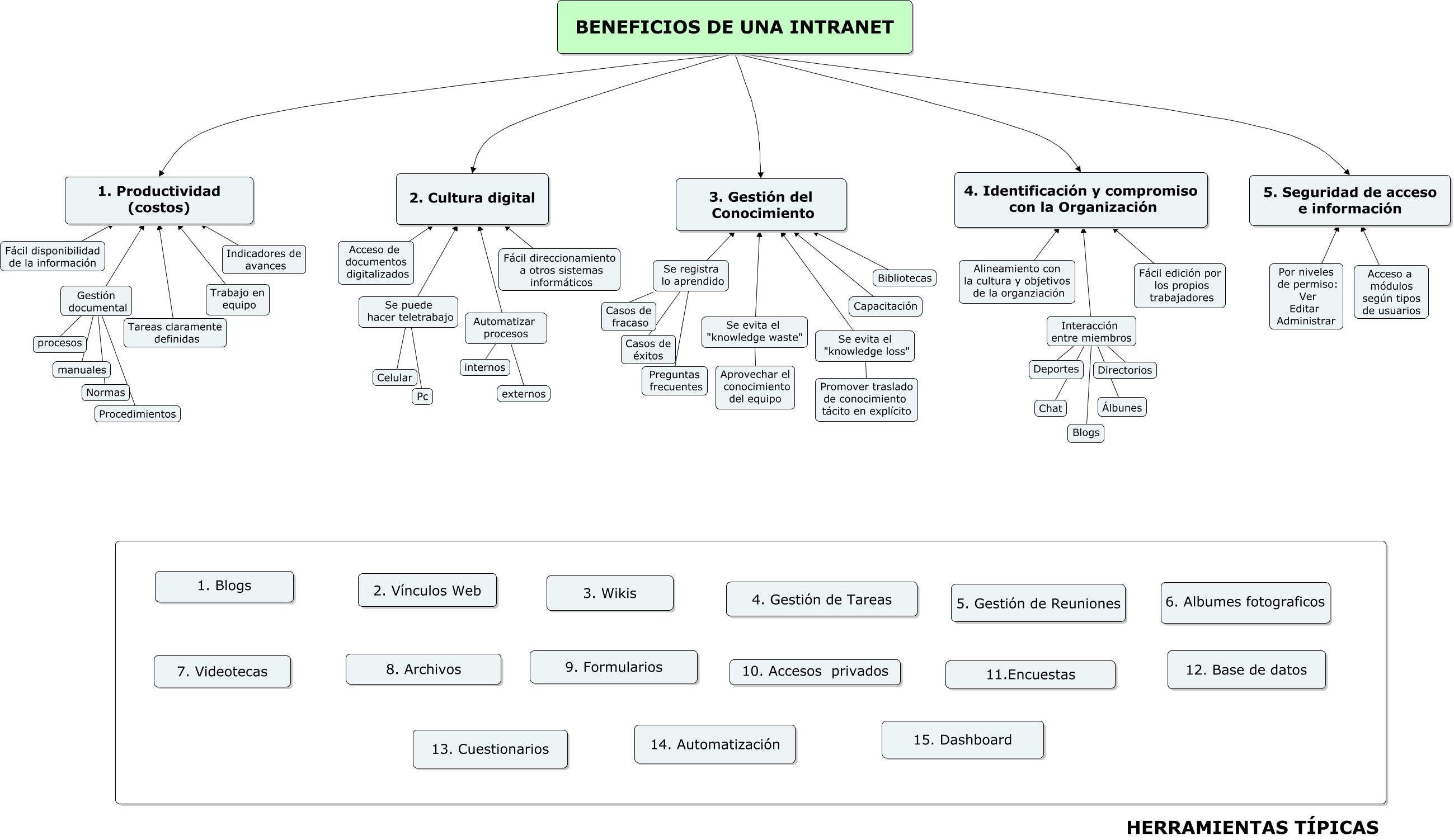 Este Cmap, tiene información relacionada con: BENEFICIOS DE UNA INTRANET, BENEFICIOS DE UNA INTRANET 3. Gestión del Conocimiento, Fácil direccionamiento a otros sistemas informáticos 2. Cultura digital, Indicadores de avances 1. Productividad (costos), Tareas claramente definidas 1. Productividad (costos), Se evita el "knowledge loss" 3. Gestión del Conocimiento, Acceso de documentos digitalizados 2. Cultura digital, Automatizar procesos 2. Cultura digital, Gestión documental procesos, Interacción entre miembros 4. Identificación y compromiso con la Organización, BENEFICIOS DE UNA INTRANET 4. Identificación y compromiso con la Organización, Interacción entre miembros Blogs, Se puede hacer teletrabajo 2. Cultura digital, Fácil edición por los propios trabajadores 4. Identificación y compromiso con la Organización, Acceso a módulos según tipos de usuarios 5. Seguridad de acceso e información, Trabajo en equipo 1. Productividad (costos), Interacción entre miembros Chat, Gestión documental Procedimientos, Se registra lo aprendido Casos de fracaso, Interacción entre miembros Álbunes, Se evita el "knowledge waste" Aprovechar el conocimiento del equipo