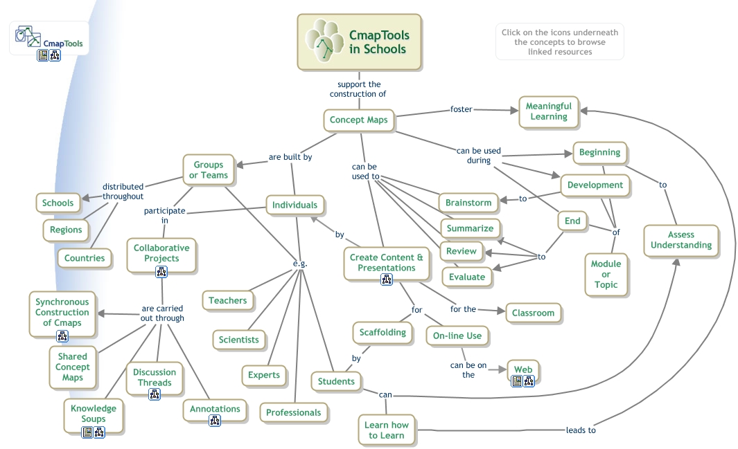 This Concept Map, created with IHMC CmapTools, has information related to: CmapTools in Schools, Learn how to Learn leads to Meaningful Learning, Groups or Teams participate in Collaborative Projects, Individuals e.g. Students, CmapTools in Schools support the construction of Concept Maps, Create Content & Presentations for Scaffolding, Groups or Teams distributed throughout Regions, Beginning of Module or Topic, End to Evaluate, Development of Module or Topic, Individuals participate in Collaborative Projects, Collaborative Projects are carried out through Shared Concept Maps, End to Summarize, Beginning to Assess Understanding, End to Review, Individuals e.g. Professionals, Collaborative Projects are carried out through Annotations, Concept Maps foster Meaningful Learning, Groups or Teams e.g. Experts, Concept Maps can be used during Development, Individuals e.g. Experts