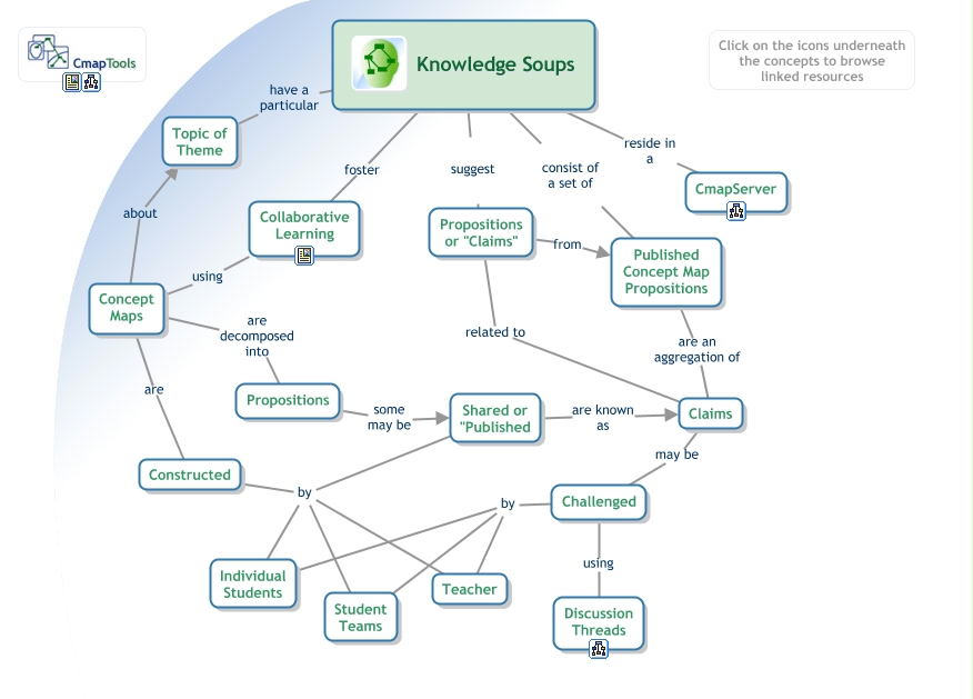 This Concept Map, created with IHMC CmapTools, has information related to: CmapTools - Knowledge Soups, Concept Maps about Topic of Theme, Constructed by Student Teams, Shared or "Published by Teacher, Concept Maps are decomposed into Propositions, Knowledge Soups consist of a set of Published Concept Map Propositions, Knowledge Soups have a particular Topic of Theme, Shared or "Published are known as Claims, Constructed by Individual Students, Challenged by Individual Students, Collaborative Learning using Concept Maps, Knowledge Soups foster Collaborative Learning, Claims may be Challenged, Challenged by Student Teams, Challenged by Teacher, Shared or "Published by Individual Students, Propositions some may be Shared or "Published, Knowledge Soups suggest Propositions or "Claims", Challenged using Discussion Threads, Propositions or "Claims" from Published Concept Map Propositions, Shared or "Published by Student Teams