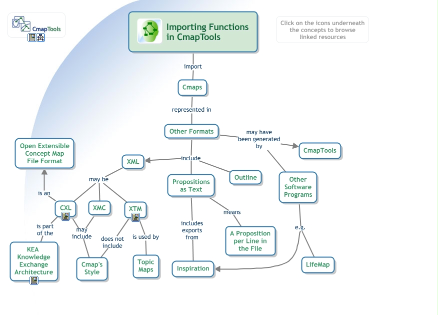 This Concept Map, created with IHMC CmapTools, has information related to: CmapTools - Importing Cmaps, XML may be XMC, CXL is part of the KEA Knowledge Exchange Architecture, XTM does not include Cmap's Style, Other Formats may have been generated by CmapTools, Other Formats include XML, XTM is used by Topic Maps, Cmaps represented in Other Formats, Importing Functions in CmapTools import Cmaps, Other Software Programs e.g. Inspiration, Propositions as Text includes exports from Inspiration, Other Formats include Propositions as Text, CXL may include Cmap's Style, XML may be XTM, XMC may include Cmap's Style, Other Formats may have been generated by Other Software Programs, CXL is an Open Extensible Concept Map File Format, Other Software Programs e.g. LifeMap, Other Formats include Outline, XML may be CXL, Propositions as Text means A Proposition per Line in the File