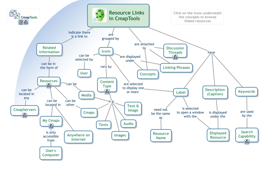 This Concept Map, created with IHMC CmapTools, has information related to: CmapTools - Resource Links, Resource Links in CmapTools have Keywords, Resources can be other Cmaps, Icons are displayed under Linking Phrases, Content Type e.g. Text & Image, Resource Links in CmapTools are grouped by Icons, Media e.g. Cmaps, Content Type e.g. Cmaps, Content Type e.g. Audio, Resource Links in CmapTools are attached to Linking Phrases, Resource Links in CmapTools are attached to Concepts, Media e.g. Audio, Media e.g. Text & Image, Resource Links in CmapTools have Description (Caption), Description (Caption) is displayed under the Displayed Resource, My Cmaps is only accessible from User's Computer, Resource Links in CmapTools indicate there is a link to Related Information, Resources can be located in any CmapServers, Resources can be Media, Icons are displayed under Concepts, Content Type e.g. Texts
