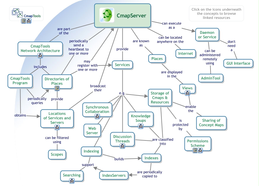 This Concept Map, created with IHMC CmapTools, has information related to: CmapTools - CmapServer, CmapTools Network Architecture includes Directories of Places, Daemon or Service don't need a GUI Interface, IndexServers support Searching, Services e.g. Knowledge Soups, Services e.g. Storage of Cmaps & Resources, CmapTools Network Architecture includes CmapTools Program, Directories of Places may register with one or more Services, Services e.g. Discussion Threads, Views enable the Sharing of Concept Maps, Services e.g. Synchronous Collaboration, CmapTools CmapServers can execute as a Daemon or Service, CmapTools CmapServers provide Services, Indexes are periodically copied to IndexServers, CmapTools CmapServers broadcast their Locations of Services and Servers, CmapTools CmapServers are known as Places, CmapTools Program obtains Locations of Services and Servers, Directories of Places provide Locations of Services and Servers, Places are displayed in the Views, Daemon or Service can be administered remotely using AdminTool, Indexing support Searching