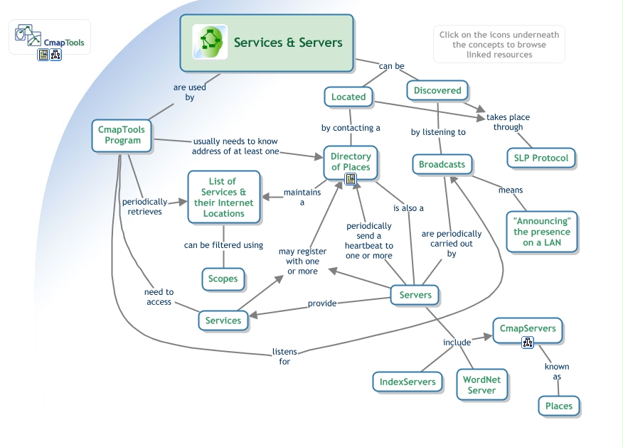 This Concept Map, created with IHMC CmapTools, has information related to: CmapTools - Locating & Discovering Services & Servers, Servers provide Services, List of Services & their Internet Locations can be filtered using Scopes, Servers include WordNet Server, Directory of Places is also a Servers, Broadcasts are periodically carried out by Servers, CmapTools Program need to access Services, Services may register with one or more Directory of Places, CmapTools Services and Servers can be Located, Broadcasts means "Announcing" the presence on a LAN, Located takes place through SLP Protocol, CmapTools Services and Servers can be Discovered, Located by contacting a Directory of Places, Servers include IndexServers, Discovered by listening to Broadcasts, CmapTools Services and Servers are used by CmapTools Program, CmapTools Program usually needs to know address of at least one Directory of Places, Servers include CmapServers, CmapTools Program periodically retrieves List of Services & their Internet Locations, Directory of Places maintains a List of Services & their Internet Locations, Servers periodically send a heartbeat to one or more Directory of Places