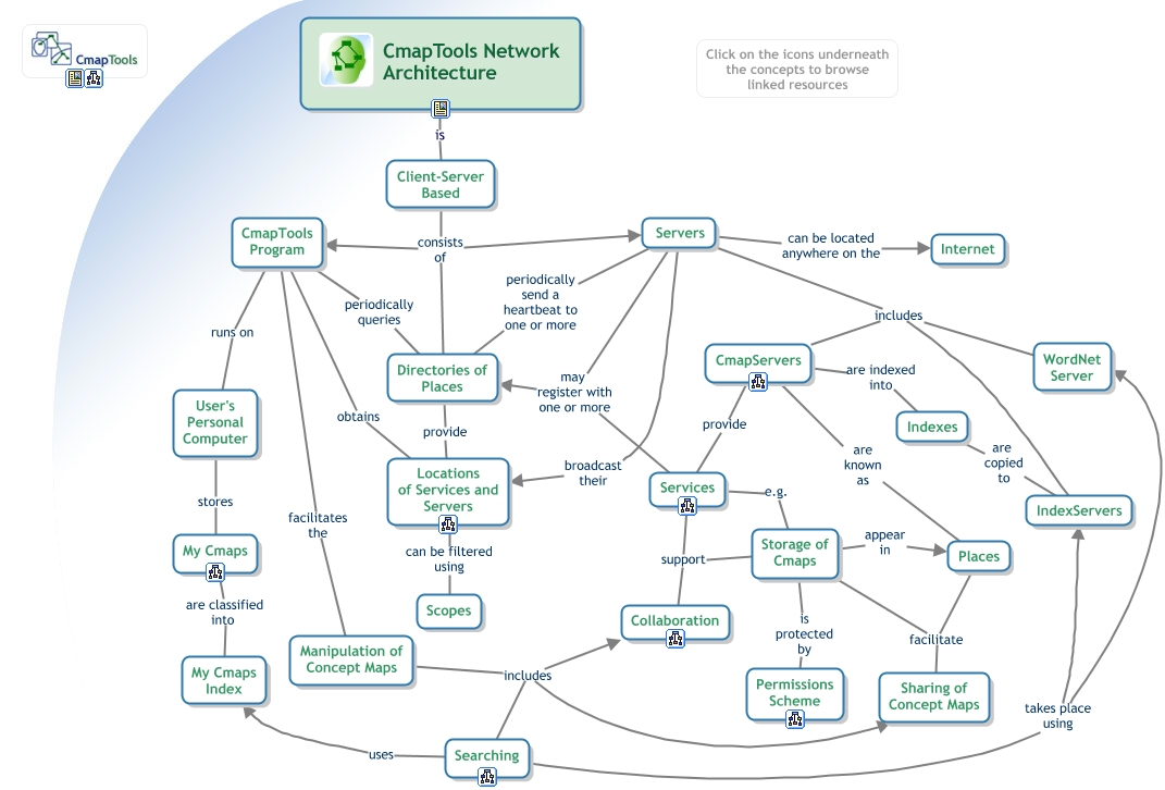 This Concept Map, created with IHMC CmapTools, has information related to: CmapTools - Network Architecture, Servers includes CmapServers, Client-Server Based consists of CmapTools Program, CmapTools Program runs on User's Personal Computer, CmapServers are known as Places, Servers includes WordNet Server, My Cmaps are classified into My Cmaps Index, CmapTools Program obtains Locations of Services and Servers, Directories of Places provide Locations of Services and Servers, CmapTools Program periodically queries Directories of Places, Servers can be located anywhere on the Internet, Searching uses My Cmaps Index, Locations of Services and Servers can be filtered using Scopes, Storage of Cmaps appear in Places, Servers may register with one or more Directories of Places, Manipulation of Concept Maps includes Collaboration, Services support Collaboration, CmapServers provide Services, Searching takes place using WordNet Server, CmapTools Program facilitates the Manipulation of Concept Maps, Servers includes IndexServers