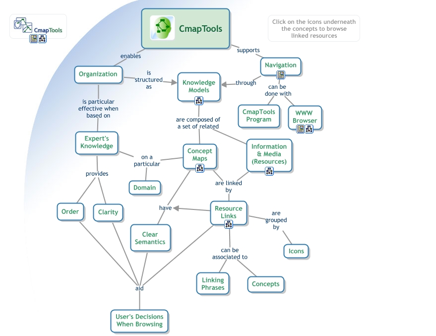 This Concept Map, created with IHMC CmapTools, has information related to: CmapTools for Navigating and Browsing, Expert's Knowledge provides Clarity, Concept Maps have Clear Semantics, Expert's Knowledge on a particular Domain, Resource Links can be associated to Linking Phrases, Clarity aid User's Decisions When Browsing, Information & Media (Resources) are linked by Resource Links, Concept Maps are linked by Resource Links, Concept Maps on a particular Domain, Resource Links are grouped by Icons, Navigation can be done with CmapTools Program, Organization is particular effective when based on Expert's Knowledge, CmapTools for Navigating and Browsing supports Navigation, Resource Links can be associated to Concepts, Resource Links have Clear Semantics, Expert's Knowledge provides Order, Organization is structured as Knowledge Models, Clear Semantics aid User's Decisions When Browsing, Knowledge Models are composed of a set of related Concept Maps, CmapTools for Navigating and Browsing enables Organization, Navigation can be done with WWW Browser