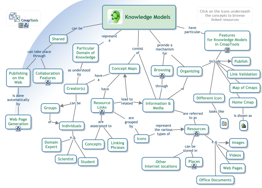Este Cmap, tiene información relacionada con: CmapTools - Knowledge Models, CmapTools Knowledge Models consist of Concept Maps, Concept Maps have a Creator(s), Resources can be stored in Places, Resource Links are grouped by Icons, Publishing on the Web is done automatically by Web Page Generation, Individuals e.g. Domain Expert, Creator(s) can be Individuals, CmapTools Knowledge Models consist of Information & Media, CmapTools Knowledge Models can be Shared, Information & Media are referred to as Resources, Home Cmap is shown as, Organizing include Map of Cmaps, Individuals e.g. Student, Resource Links are associated to Concepts, Organizing include Link Validation, Organizing include Different Icon, CmapTools Knowledge Models provide a mechanism for Organizing, Shared can take place through Collaboration Features, Resources e.g. Web Pages, Organizing of Information & Media