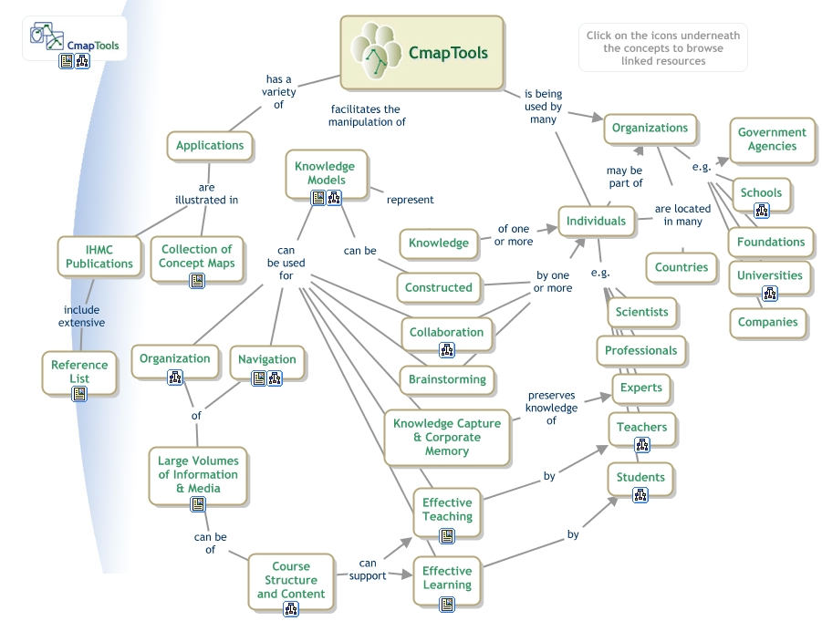 This Concept Map, created with IHMC CmapTools, has information related to: CmapTools - Applications, CmapTools Applications facilitates the manipulation of Knowledge Models, Organizations e.g. Foundations, Organizations e.g. Companies, Organizations e.g. Government Agencies, Knowledge Models can be used for Collaboration, Applications are illustrated in IHMC Publications, Brainstorming by one or more Individuals, Knowledge Models can be used for Effective Learning, Constructed by one or more Individuals, Knowledge of one or more Individuals, Organization of Large Volumes of Information & Media, Organizations are located in many Countries, Effective Teaching by Teachers, Knowledge Models can be Constructed, IHMC Publications include extensive Reference List, Knowledge Capture & Corporate Memory preserves knowledge of Experts, Knowledge Models can be used for Knowledge Capture & Corporate Memory, Course Structure and Content can support Effective Learning, CmapTools Applications is being used by many Individuals, Individuals e.g. Experts