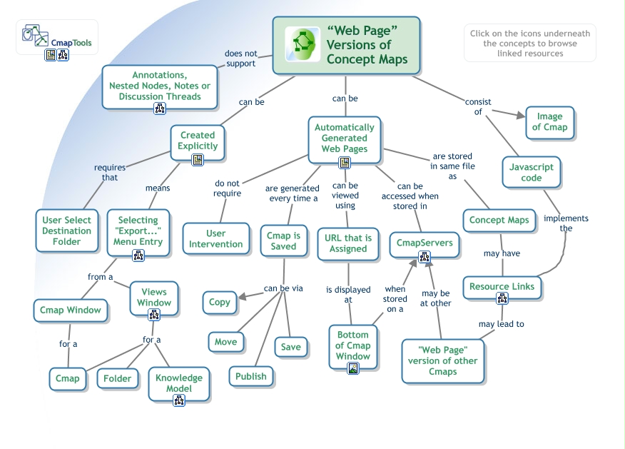 This Concept Map, created with IHMC CmapTools, has information related to: CmapTools - HTML Generation, Created Explicitly requires that User Select Destination Folder, Views Window for a Folder, Javascript code implements the Resource Links, Cmap is Saved can be via Move, Web Page Versions of Concept Maps consist of Javascript code, Cmap Window for a Cmap, Created Explicitly means Selecting "Export..." Menu Entry, URL that is Assigned is displayed at Bottom of Cmap Window, Concept Maps may have Resource Links, Web Page Versions of Concept Maps consist of Image of Cmap, Automatically Generated Web Pages are stored in same file as Concept Maps, Selecting "Export..." Menu Entry from a Views Window, Cmap is Saved can be via Publish, Bottom of Cmap Window when stored on a CmapServers, Cmap is Saved can be via Copy, Web Page Versions of Concept Maps does not support Annotations, Nested Nodes, Notes or Discussion Threads, Web Page Versions of Concept Maps can be Created Explicitly, "Web Page" version of other Cmaps may be at other CmapServers, Automatically Generated Web Pages can be accessed when stored in CmapServers, Views Window for a Knowledge Model