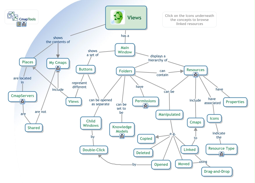 This Concept Map, created with IHMC CmapTools, has information related to: CmapTools - Views, Main Window displays a hierarchy of Folders, Buttons represent different Views, Main Window displays a hierarchy of Resources, Folders can be set to be Knowledge Models, Folders can contain Resources, Places are located in CmapServers, Child Windows by Double-Click, Manipulated e.g. Deleted, Linked using Drag-and-Drop, Resources include Cmaps, Opened by Double-Click, CmapTools Views shows the contents of Places, CmapTools Views has a Main Window, Views include Places, Manipulated e.g. Moved, Main Window shows a set of Buttons, Buttons can be opened as separate Child Windows, Folders can be opened as separate Child Windows, Moved using Drag-and-Drop, Views include My Cmaps