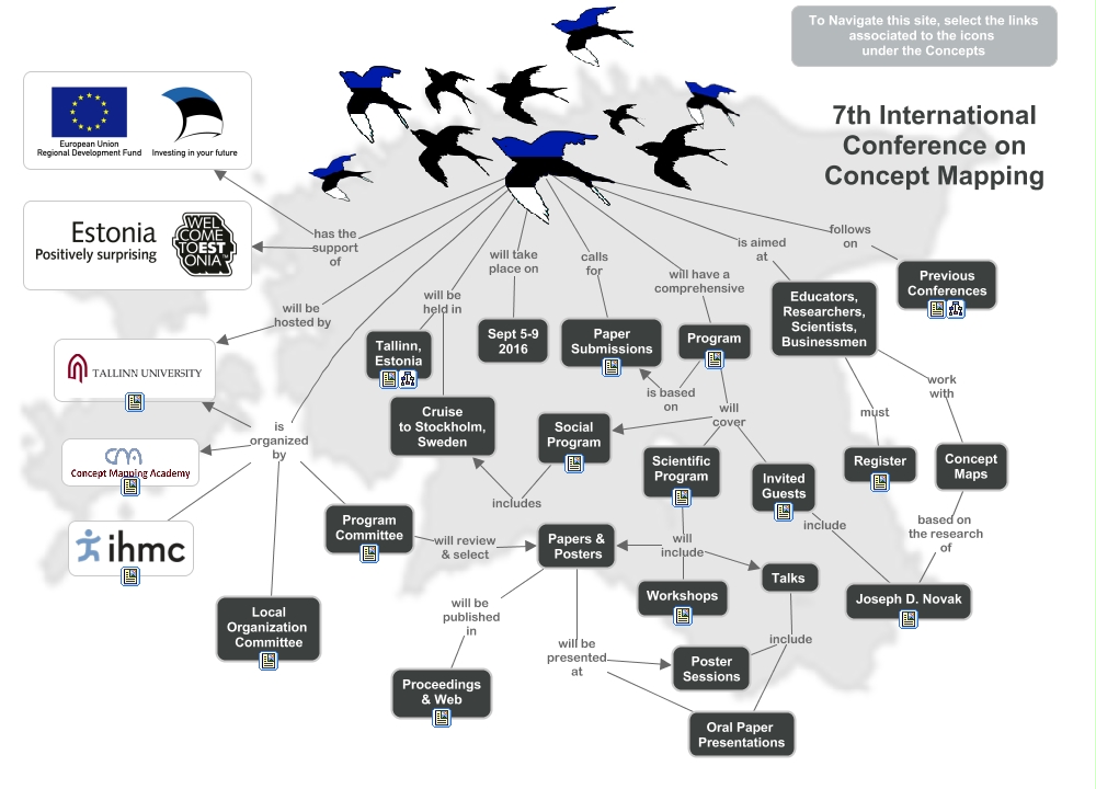 This Concept Map, created with IHMC CmapTools, has information related to: 7th Concept Mapping Conference, is organized by Program Committee, has the support of, will be held in Tallinn, Estonia, is aimed at Educators, Researchers, Scientists, Businessmen, calls for Paper Submissions, Program is based on Paper Submissions, follows on Previous Conferences, Papers & Posters will be published in Proceedings & Web, Educators, Researchers, Scientists, Businessmen must Register, will have a comprehensive Program, Social Program includes Cruise to Stockholm, Sweden, Papers & Posters will be presented at Oral Paper Presentations, Concept Maps based on the research of Joseph D. Novak, is organized by, will be hosted by, Scientific Program will include Talks, is organized by Local Organization Committee, Invited Guests include Joseph D. Novak, Papers & Posters will be presented at Poster Sessions, Talks include Oral Paper Presentations