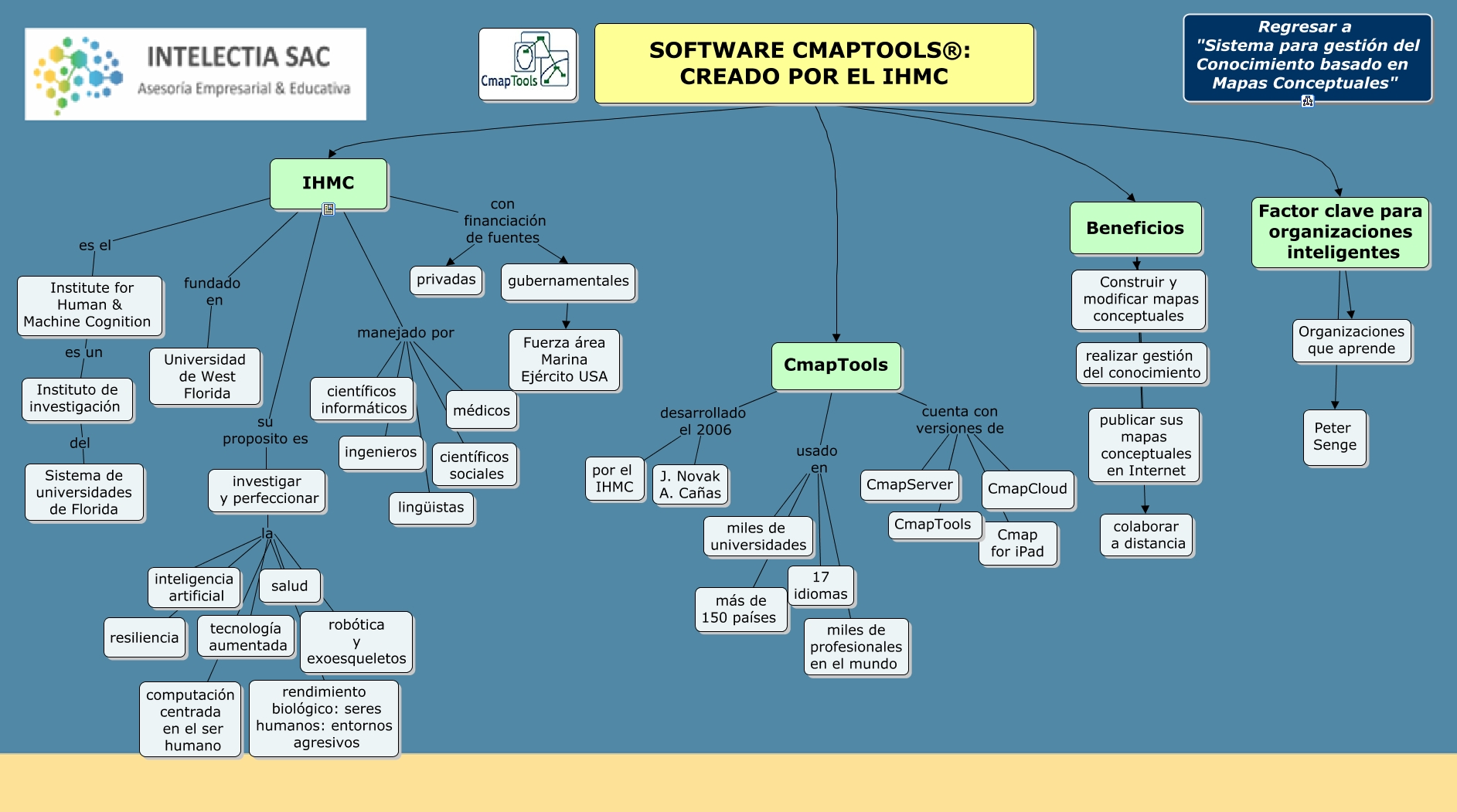 Este Cmap, tiene información relacionada con: Creación del CmapTools, Beneficios Construir y modificar mapas conceptuales, SOFTWARE CMAPTOOLS®: CREADO POR EL IHMC CmapTools, CmapTools usado en miles de universidades, Instituto de investigación del Sistema de universidades de Florida, IHMC manejado por lingüistas, investigar y perfeccionar la computación centrada en el ser humano, IHMC manejado por científicos sociales, IHMC con financiación de fuentes gubernamentales, Institute for Human & Machine Cognition es un Instituto de investigación, Beneficios colaborar a distancia, CmapTools cuenta con versiones de CmapTools, IHMC con financiación de fuentes privadas, CmapTools cuenta con versiones de CmapCloud, CmapTools usado en más de 150 países, IHMC fundado en Universidad de West Florida, investigar y perfeccionar la inteligencia artificial, IHMC manejado por científicos informáticos, CmapTools desarrollado el 2006 por el IHMC, CmapTools usado en miles de profesionales en el mundo, CmapTools cuenta con versiones de Cmap for iPad