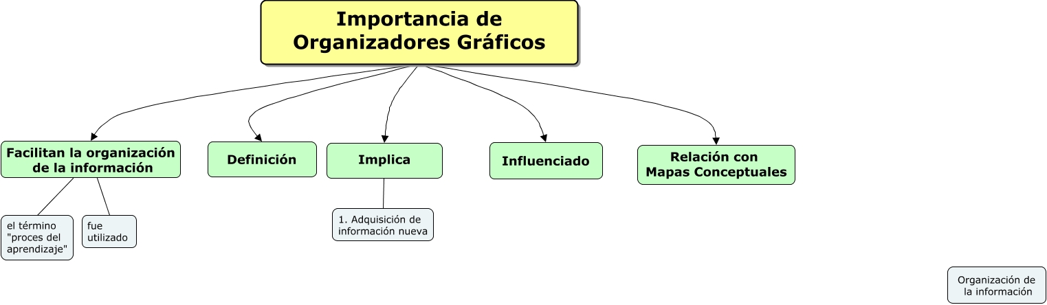 Este Cmap, tiene información relacionada con: Importancia de Organizadores Gráficos, Importancia de Organizadores Gráficos Relación con Mapas Conceptuales, Facilitan la organización de la información el término "proces del aprendizaje", Implica 1. Adquisición de información nueva, Importancia de Organizadores Gráficos Facilitan la organización de la información, Importancia de Organizadores Gráficos Influenciado, Importancia de Organizadores Gráficos Definición, Importancia de Organizadores Gráficos Implica, Facilitan la organización de la información fue utilizado