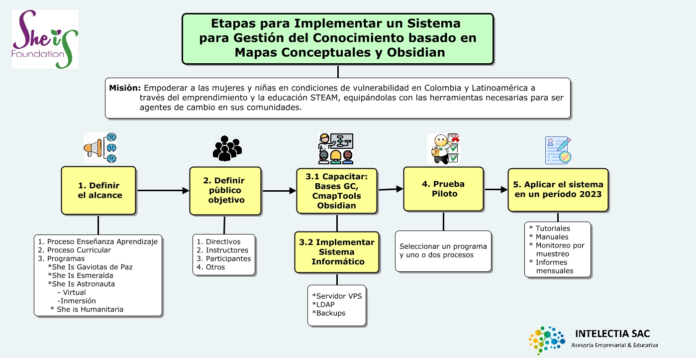Este Cmap, tiene información relacionada con: SGC - MC - SHE IS, 2. Definir público objetivo 1. Directivos 2. Instructores 3. Participantes 4. Otros, 3.1 Capacitar: Bases GC, CmapTools Obsidian 3.2 Implementar Sistema Informático, 4. Prueba Piloto Seleccionar un programa y uno o dos procesos, 2. Definir público objetivo 3.1 Capacitar: Bases GC, CmapTools Obsidian, 4. Prueba Piloto 5. Aplicar el sistema en un período 2023, 3.2 Implementar Sistema Informático *Servidor VPS *LDAP *Backups, 5. Aplicar el sistema en un período 2023 * Tutoriales * Manuales * Monitoreo por muestreo * Informes mensuales, 3.1 Capacitar: Bases GC, CmapTools Obsidian 4. Prueba Piloto, 1. Definir el alcance 2. Definir público objetivo, 1. Definir el alcance 1. Proceso Enseñanza Aprendizaje 2. Proceso Curricular 3. Programas *She Is Gaviotas de Paz *She Is Esmeralda *She Is Astronauta - Virtual -Inmersión * She is Humanitaria, Etapas para Implementar un Sistema para Gestión del Conocimiento basado en Mapas Conceptuales y Obsidian Misión: Empoderar a las mujeres y niñas en condiciones de vulnerabilidad en Colombia y Latinoamérica a través del emprendimiento y la educación STEAM, equipándolas con las herramientas necesarias para ser agentes de cambio en sus comunidades.