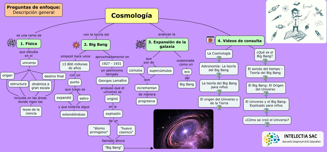 Este Cmap, tiene información relacionada con: Cosmología, 4. Videos de consulta ¿Qué es el Big Bang?, Cosmología es una rama de 1. Física, origen incluida en las áreas donde rigen las leyes de la ciencia, expandió y que todavía sigue extendiéndose, supercúmulos que incrementan, 3. Expansión de la galaxia que son de cúmulos, 13 800 millones de años con un punto, 3. Expansión de la galaxia ocasionada como un eco, universo su estructura, "átomo primigenio" llamado ahora "Big Bang", universo su origen, universo su destino final, 3. Expansión de la galaxia que son de supercúmulos, Cosmología ven la teoría del 2. Big Bang, incrementan de manera progresiva, 1927 - 1931 un astrónomo llamado Georges Lemaître, 2. Big Bang aproximadamente en 1927 - 1931, 4. Videos de consulta La Cosmología, punto que luego se expandió, eco del Big Bang