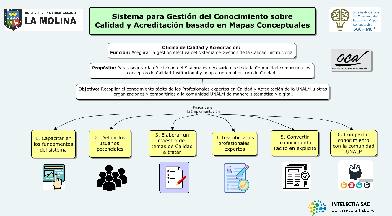 Este Cmap, tiene información relacionada con: SGC - MC - UNALM, Objetivo: Recopilar el conocimiento tácito de los Profesionales expertos en Calidad y Acreditación de la UNALM u otras organizaciones y compartirlos a la comunidad UNALM de manera sistemática y digital. Pasos para la Implementación 2. Definir los usuarios potenciales, Oficina de Calidad y Acreditación: Función: Asegurar la gestión efectiva del sistema de Gestión de la Calidad Institucional Propósito: Para asegurar la efectividad del Sistema es necesario que toda la Comunidad comprenda los conceptos de Calidad Institucional y adopte una real cultura de Calidad., Objetivo: Recopilar el conocimiento tácito de los Profesionales expertos en Calidad y Acreditación de la UNALM u otras organizaciones y compartirlos a la comunidad UNALM de manera sistemática y digital. Pasos para la Implementación 6. Compartir conocimiento con la comunidad UNALM, Objetivo: Recopilar el conocimiento tácito de los Profesionales expertos en Calidad y Acreditación de la UNALM u otras organizaciones y compartirlos a la comunidad UNALM de manera sistemática y digital. Pasos para la Implementación 4. Inscribir a los profesionales expertos, Propósito: Para asegurar la efectividad del Sistema es necesario que toda la Comunidad comprenda los conceptos de Calidad Institucional y adopte una real cultura de Calidad. Objetivo: Recopilar el conocimiento tácito de los Profesionales expertos en Calidad y Acreditación de la UNALM u otras organizaciones y compartirlos a la comunidad UNALM de manera sistemática y digital., Objetivo: Recopilar el conocimiento tácito de los Profesionales expertos en Calidad y Acreditación de la UNALM u otras organizaciones y compartirlos a la comunidad UNALM de manera sistemática y digital. Pasos para la Implementación 5. Convertir conocimiento Tácito en explicito, Objetivo: Recopilar el conocimiento tácito de los Profesionales expertos en Calidad y Acreditación de la UNALM u otras organizaciones y compartirlos a la comunidad UNALM de manera sistemática y digital. Pasos para la Implementación 3. Elaborar un maestro de temas de Calidad a tratar, Objetivo: Recopilar el conocimiento tácito de los Profesionales expertos en Calidad y Acreditación de la UNALM u otras organizaciones y compartirlos a la comunidad UNALM de manera sistemática y digital. Pasos para la Implementación 1. Capacitar en los fundamentos del sistema, Sistema para Gestión del Conocimiento sobre Calidad y Acreditación basado en Mapas Conceptuales Oficina de Calidad y Acreditación: Función: Asegurar la gestión efectiva del sistema de Gestión de la Calidad Institucional