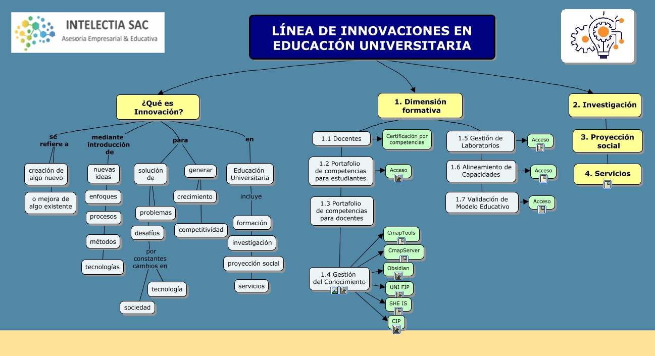 Este Cmap, tiene información relacionada con: Línea de Innovaciones en Educ Univ, 1. Dimensión formativa 1.1 Docentes, 1.1 Docentes 1.4 Gestión del Conocimiento, ¿Qué es Innovación? mediante introducción de tecnologías, 2. Investigación 4. Servicios, 1.4 Gestión del Conocimiento CIP, ¿Qué es Innovación? para generar, 1.4 Gestión del Conocimiento SHE IS, generar crecimiento, 1.4 Gestión del Conocimiento CmapServer, 1.2 Portafolio de competencias para estudiantes Acceso, ¿Qué es Innovación? para solución de, 1.4 Gestión del Conocimiento CmapTools, desafíos por constantes cambios en sociedad, ¿Qué es Innovación? en Educación Universitaria, solución de desafíos, ¿Qué es Innovación? se refiere a creación de algo nuevo, solución de problemas, generar competitividad, 1. Dimensión formativa 1.5 Gestión de Laboratorios, 1.7 Validación de Modelo Educativo Acceso