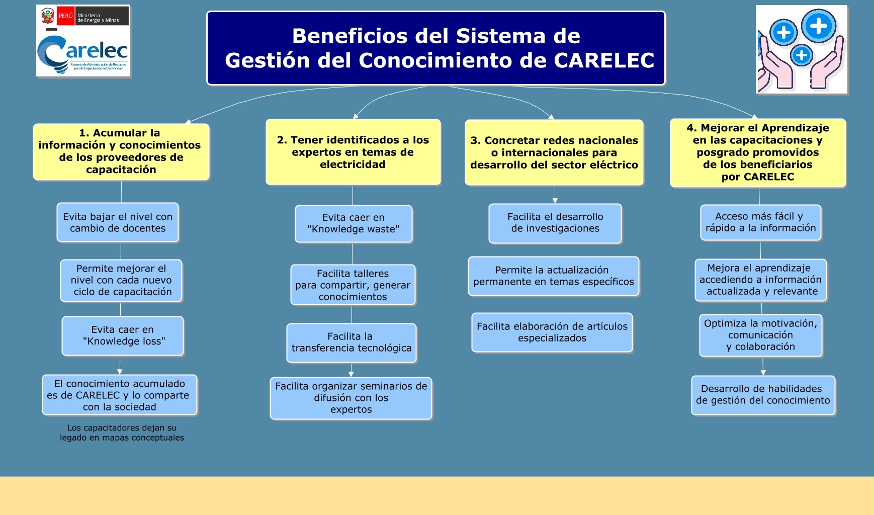 Este Cmap, tiene información relacionada con: Beneficios del Sistema de Gestión del Conocimiento, Beneficios del Sistema de Gestión del Conocimiento de CARELEC 2. Tener identificados a los expertos en temas de electricidad, 3. Concretar redes nacionales o internacionales para desarrollo del sector eléctrico Facilita el desarrollo de investigaciones, 4. Mejorar el Aprendizaje en las capacitaciones y posgrado promovidos de los beneficiarios por CARELEC Desarrollo de habilidades de gestión del conocimiento, Beneficios del Sistema de Gestión del Conocimiento de CARELEC 4. Mejorar el Aprendizaje en las capacitaciones y posgrado promovidos de los beneficiarios por CARELEC, Beneficios del Sistema de Gestión del Conocimiento de CARELEC 3. Concretar redes nacionales o internacionales para desarrollo del sector eléctrico, 1. Acumular la información y conocimientos de los proveedores de capacitación El conocimiento acumulado es de CARELEC y lo comparte con la sociedad, 2. Tener identificados a los expertos en temas de electricidad Facilita organizar seminarios de difusión con los expertos, Beneficios del Sistema de Gestión del Conocimiento de CARELEC 1. Acumular la información y conocimientos de los proveedores de capacitación