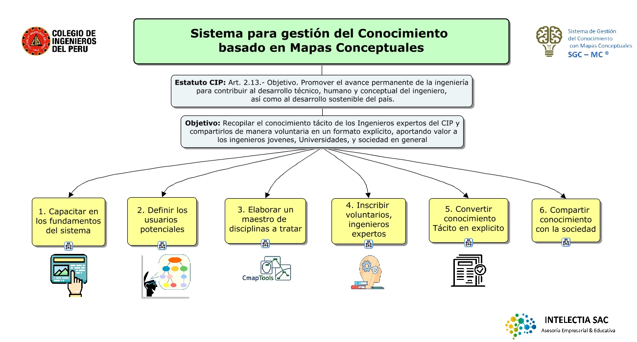 Este Cmap, tiene información relacionada con: Sistema de Gestión del Conocimiento basado en mapas conceptuales, Objetivo: Recopilar el conocimiento tácito de los Ingenieros expertos del CIP y compartirlos de manera voluntaria en un formato explícito, aportando valor a los ingenieros jovenes, Universidades, y sociedad en general 6. Compartir conocimiento con la sociedad, Objetivo: Recopilar el conocimiento tácito de los Ingenieros expertos del CIP y compartirlos de manera voluntaria en un formato explícito, aportando valor a los ingenieros jovenes, Universidades, y sociedad en general 3. Elaborar un maestro de disciplinas a tratar, Objetivo: Recopilar el conocimiento tácito de los Ingenieros expertos del CIP y compartirlos de manera voluntaria en un formato explícito, aportando valor a los ingenieros jovenes, Universidades, y sociedad en general 2. Definir los usuarios potenciales, Sistema para gestión del Conocimiento basado en Mapas Conceptuales Estatuto CIP: Art. 2.13.- Objetivo. Promover el avance permanente de la ingeniería para contribuir al desarrollo técnico, humano y conceptual del ingeniero, así como al desarrollo sostenible del país., Objetivo: Recopilar el conocimiento tácito de los Ingenieros expertos del CIP y compartirlos de manera voluntaria en un formato explícito, aportando valor a los ingenieros jovenes, Universidades, y sociedad en general 4. Inscribir voluntarios, ingenieros expertos, Objetivo: Recopilar el conocimiento tácito de los Ingenieros expertos del CIP y compartirlos de manera voluntaria en un formato explícito, aportando valor a los ingenieros jovenes, Universidades, y sociedad en general 5. Convertir conocimiento Tácito en explicito, Objetivo: Recopilar el conocimiento tácito de los Ingenieros expertos del CIP y compartirlos de manera voluntaria en un formato explícito, aportando valor a los ingenieros jovenes, Universidades, y sociedad en general 1. Capacitar en los fundamentos del sistema, Estatuto CIP: Art. 2.13.- Objetivo. Promover el avance permanente de la ingeniería para contribuir al desarrollo técnico, humano y conceptual del ingeniero, así como al desarrollo sostenible del país. Objetivo: Recopilar el conocimiento tácito de los Ingenieros expertos del CIP y compartirlos de manera voluntaria en un formato explícito, aportando valor a los ingenieros jovenes, Universidades, y sociedad en general
