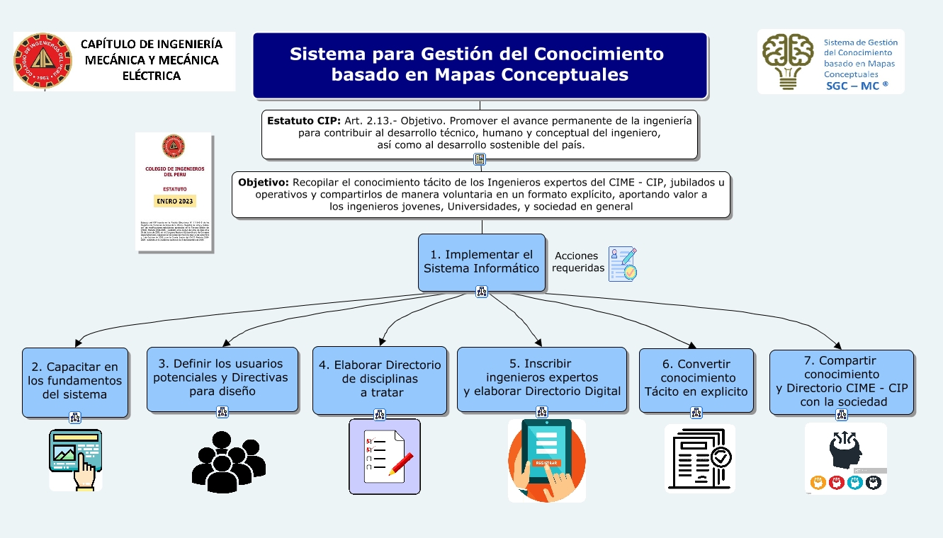 Este Cmap, tiene información relacionada con: SGC - MC - CIME - CIP, 1. Implementar el Sistema Informático 3. Definir los usuarios potenciales y Directivas para diseño, Objetivo: Recopilar el conocimiento tácito de los Ingenieros expertos del CIME - CIP, jubilados u operativos y compartirlos de manera voluntaria en un formato explícito, aportando valor a los ingenieros jovenes, Universidades, y sociedad en general 1. Implementar el Sistema Informático, 1. Implementar el Sistema Informático 2. Capacitar en los fundamentos del sistema, 1. Implementar el Sistema Informático 6. Convertir conocimiento Tácito en explicito, Estatuto CIP: Art. 2.13.- Objetivo. Promover el avance permanente de la ingeniería para contribuir al desarrollo técnico, humano y conceptual del ingeniero, así como al desarrollo sostenible del país. Objetivo: Recopilar el conocimiento tácito de los Ingenieros expertos del CIME - CIP, jubilados u operativos y compartirlos de manera voluntaria en un formato explícito, aportando valor a los ingenieros jovenes, Universidades, y sociedad en general, 1. Implementar el Sistema Informático 4. Elaborar Directorio de disciplinas a tratar, 1. Implementar el Sistema Informático 7. Compartir conocimiento y Directorio CIME - CIP con la sociedad, 1. Implementar el Sistema Informático 5. Inscribir ingenieros expertos y elaborar Directorio Digital, Sistema para Gestión del Conocimiento basado en Mapas Conceptuales Estatuto CIP: Art. 2.13.- Objetivo. Promover el avance permanente de la ingeniería para contribuir al desarrollo técnico, humano y conceptual del ingeniero, así como al desarrollo sostenible del país.