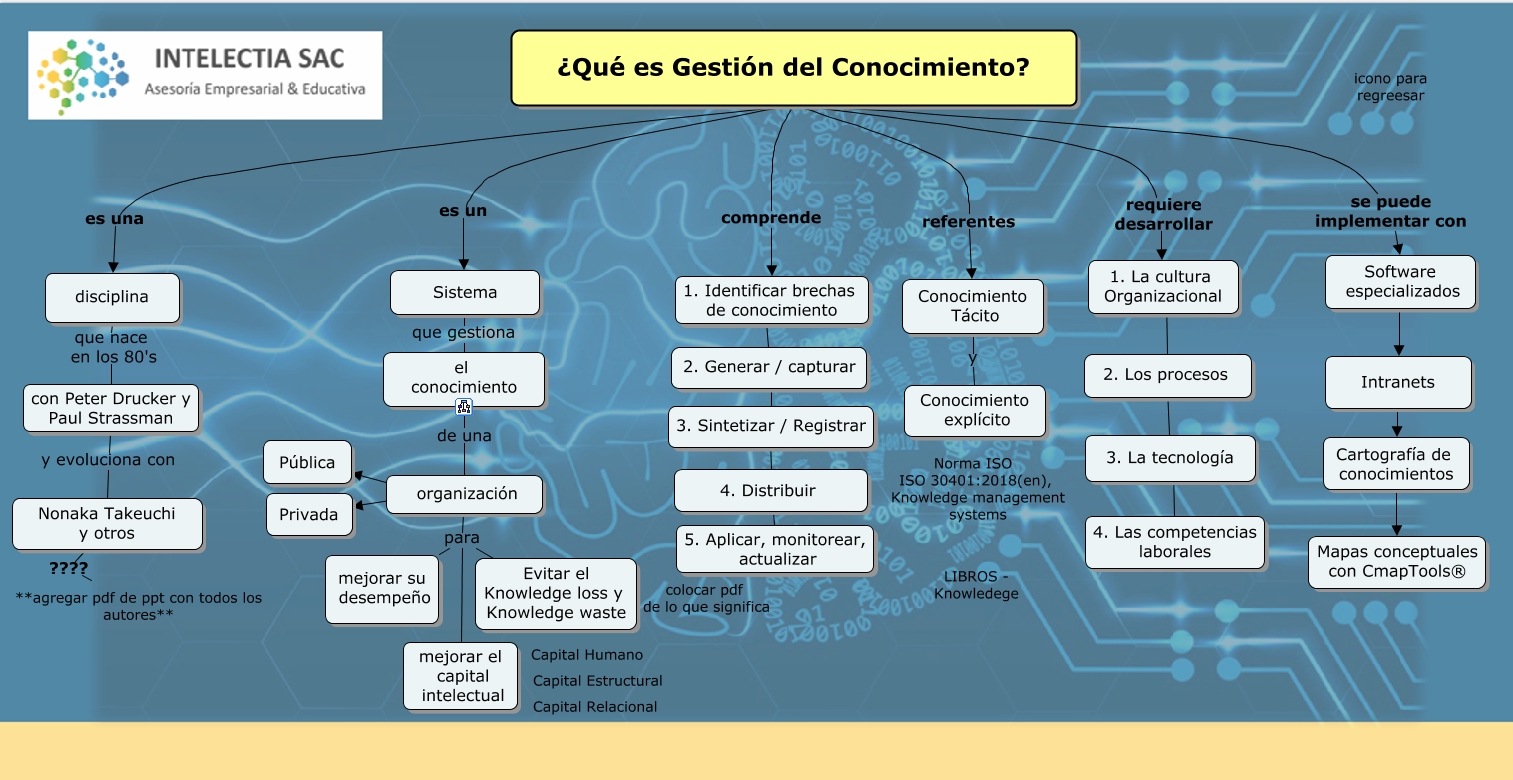 Este Cmap, tiene información relacionada con: Qué es Gestion del Conocimiento, organización ???? Pública, 1. La cultura Organizacional ???? 2. Los procesos, organización ???? Privada, Intranets Cartografía de conocimientos, ¿Qué es Gestión del Conocimiento? es una disciplina, 2. Los procesos ???? 3. La tecnología, ¿Qué es Gestión del Conocimiento? requiere desarrollar 1. La cultura Organizacional, 3. Sintetizar / Registrar ???? 4. Distribuir, 3. La tecnología ???? 4. Las competencias laborales, ¿Qué es Gestión del Conocimiento? referentes Conocimiento Tácito, organización para mejorar su desempeño, Conocimiento Tácito y Conocimiento explícito, Cartografía de conocimientos Mapas conceptuales con CmapTools®, 2. Generar / capturar ???? 3. Sintetizar / Registrar, Software especializados Intranets, ¿Qué es Gestión del Conocimiento? se puede implementar con Software especializados, Nonaka Takeuchi y otros ???? **agregar pdf de ppt con todos los autores**, con Peter Drucker y Paul Strassman y evoluciona con Nonaka Takeuchi y otros, organización para mejorar el capital intelectual, 1. Identificar brechas de conocimiento ???? 2. Generar / capturar