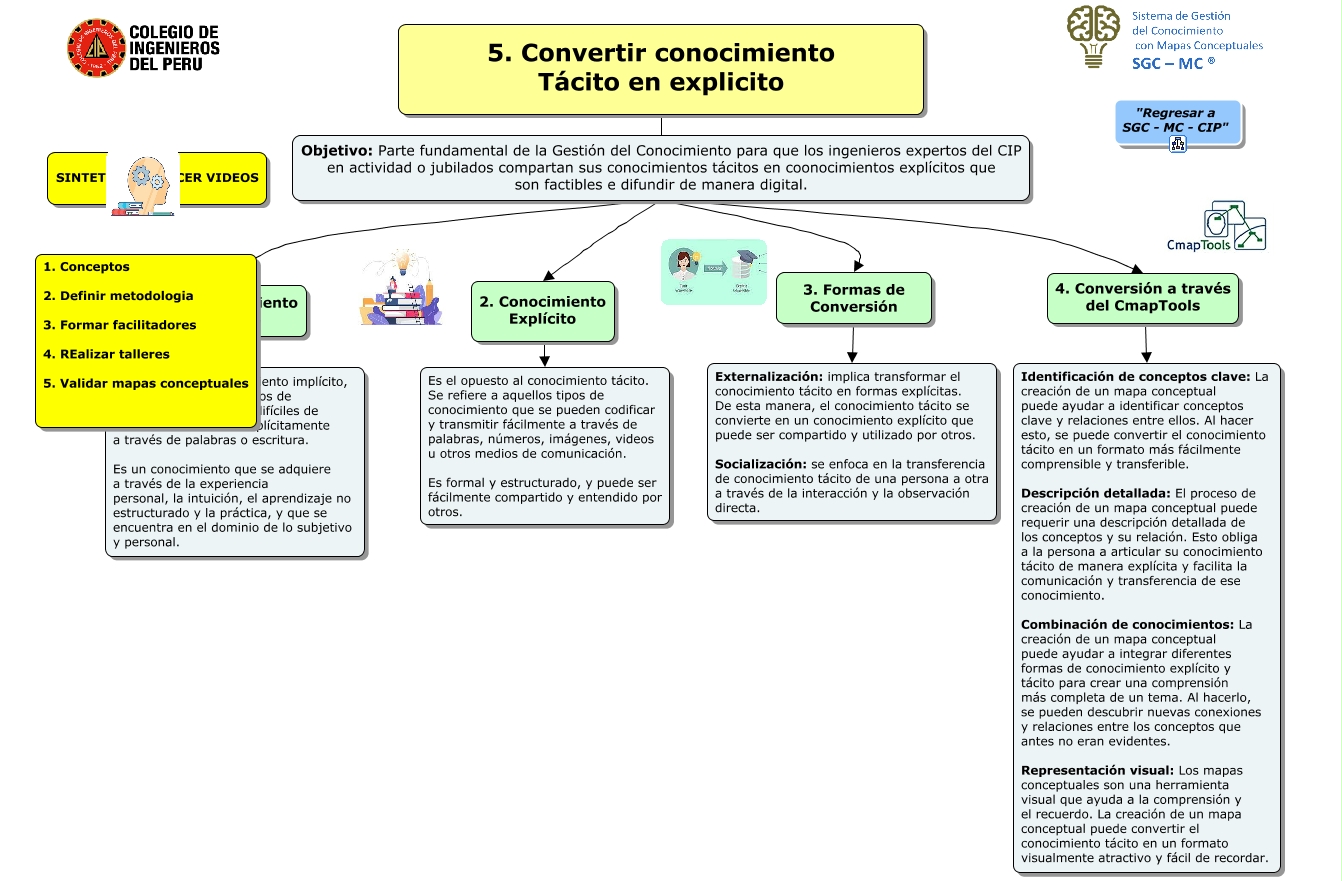 Este Cmap, tiene información relacionada con: 5. Convertir conocimiento Tácito en explicito, 5. Convertir conocimiento Tácito en explicito Objetivo: Parte fundamental de la Gestión del Conocimiento para que los ingenieros expertos del CIP en actividad o jubilados compartan sus conocimientos tácitos en coonocimientos explícitos que son factibles e difundir de manera digital., Objetivo: Parte fundamental de la Gestión del Conocimiento para que los ingenieros expertos del CIP en actividad o jubilados compartan sus conocimientos tácitos en coonocimientos explícitos que son factibles e difundir de manera digital. 4. Conversión a través del CmapTools, Objetivo: Parte fundamental de la Gestión del Conocimiento para que los ingenieros expertos del CIP en actividad o jubilados compartan sus conocimientos tácitos en coonocimientos explícitos que son factibles e difundir de manera digital. 1. Conocimiento Tácito, Objetivo: Parte fundamental de la Gestión del Conocimiento para que los ingenieros expertos del CIP en actividad o jubilados compartan sus conocimientos tácitos en coonocimientos explícitos que son factibles e difundir de manera digital. 3. Formas de Conversión, 4. Conversión a través del CmapTools Identificación de conceptos clave: La creación de un mapa conceptual puede ayudar a identificar conceptos clave y relaciones entre ellos. Al hacer esto, se puede convertir el conocimiento tácito en un formato más fácilmente comprensible y transferible. Descripción detallada: El proceso de creación de un mapa conceptual puede requerir una descripción detallada de los conceptos y su relación. Esto obliga a la persona a articular su conocimiento tácito de manera explícita y facilita la comunicación y transferencia de ese conocimiento. Combinación de conocimientos: La creación de un mapa conceptual puede ayudar a integrar diferentes formas de conocimiento explícito y tácito para crear una comprensión más completa de un tema. Al hacerlo, se pueden descubrir nuevas conexiones y relaciones entre los conceptos que antes no eran evidentes. Representación visual: Los mapas conceptuales son una herramienta visual que ayuda a la comprensión y el recuerdo. La creación de un mapa conceptual puede convertir el conocimiento tácito en un formato visualmente atractivo y fácil de recordar., Objetivo: Parte fundamental de la Gestión del Conocimiento para que los ingenieros expertos del CIP en actividad o jubilados compartan sus conocimientos tácitos en coonocimientos explícitos que son factibles e difundir de manera digital. 2. Conocimiento Explícito, 3. Formas de Conversión Externalización: implica transformar el conocimiento tácito en formas explícitas. De esta manera, el conocimiento tácito se convierte en un conocimiento explícito que puede ser compartido y utilizado por otros. Socialización: se enfoca en la transferencia de conocimiento tácito de una persona a otra a través de la interacción y la observación directa., 2. Conocimiento Explícito Es el opuesto al conocimiento tácito. Se refiere a aquellos tipos de conocimiento que se pueden codificar y transmitir fácilmente a través de palabras, números, imágenes, videos u otros medios de comunicación. Es formal y estructurado, y puede ser fácilmente compartido y entendido por otros., 1. Conocimiento Tácito Conocido como conocimiento implícito, se refiere a aquellos tipos de conocimientos que son difíciles de articular o transmitir explícitamente a través de palabras o escritura. Es un conocimiento que se adquiere a través de la experiencia personal, la intuición, el aprendizaje no estructurado y la práctica, y que se encuentra en el dominio de lo subjetivo y personal.