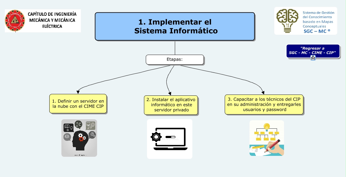 Este Cmap, tiene información relacionada con: 1. Implementar el Sistema Informático, 1. Implementar el Sistema Informático Etapas:, Etapas: 1. Definir un servidor en la nube con el CIME CIP, Etapas: 2. Instalar el aplicativo informático en este servidor privado, Etapas: 3. Capacitar a los técnicos del CIP en su administración y entregarles usuarios y password